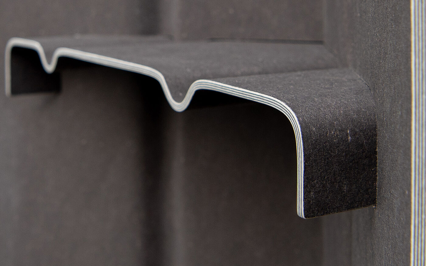 The material used here refers to the use of vulcanised fibre. Vulcanised fibre is a composite material consisting mainly of cotton and cellulose fibres, i.e. a composite material based on paper. One advantage of the material is its surprisingly high load-bearing capacity combined with low weight and a convincing degree of ecological responsibility. Several work steps are required to give the material sufficient stability for the requirements of a piece of furniture. The material thickness of the award-winning objects is between around 3.2 and 4 millimetres (mm). 4 mm vulcanised fibre weighs 1.26 kg/m². In comparison: 4 mm birch veneer weighs 2.72 kg/m².