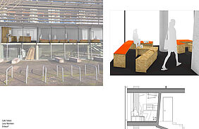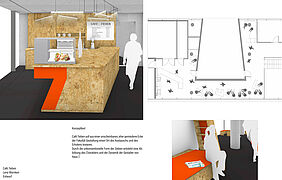 The café is located within the building of the design faculty of the Wismar University of Applied Sciences in building 7a. It is right next to the lecture hall on the mezzanine floor where the coffee machines were previously. The place should serve to represent the students and lecturers as well as offer space for communication, relaxation and smaller events.