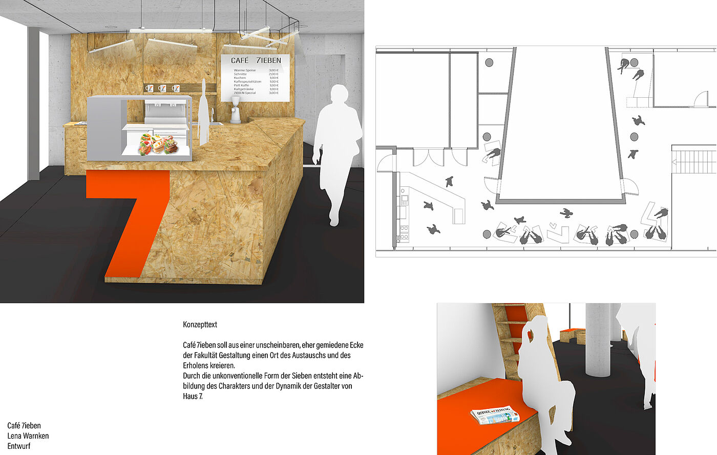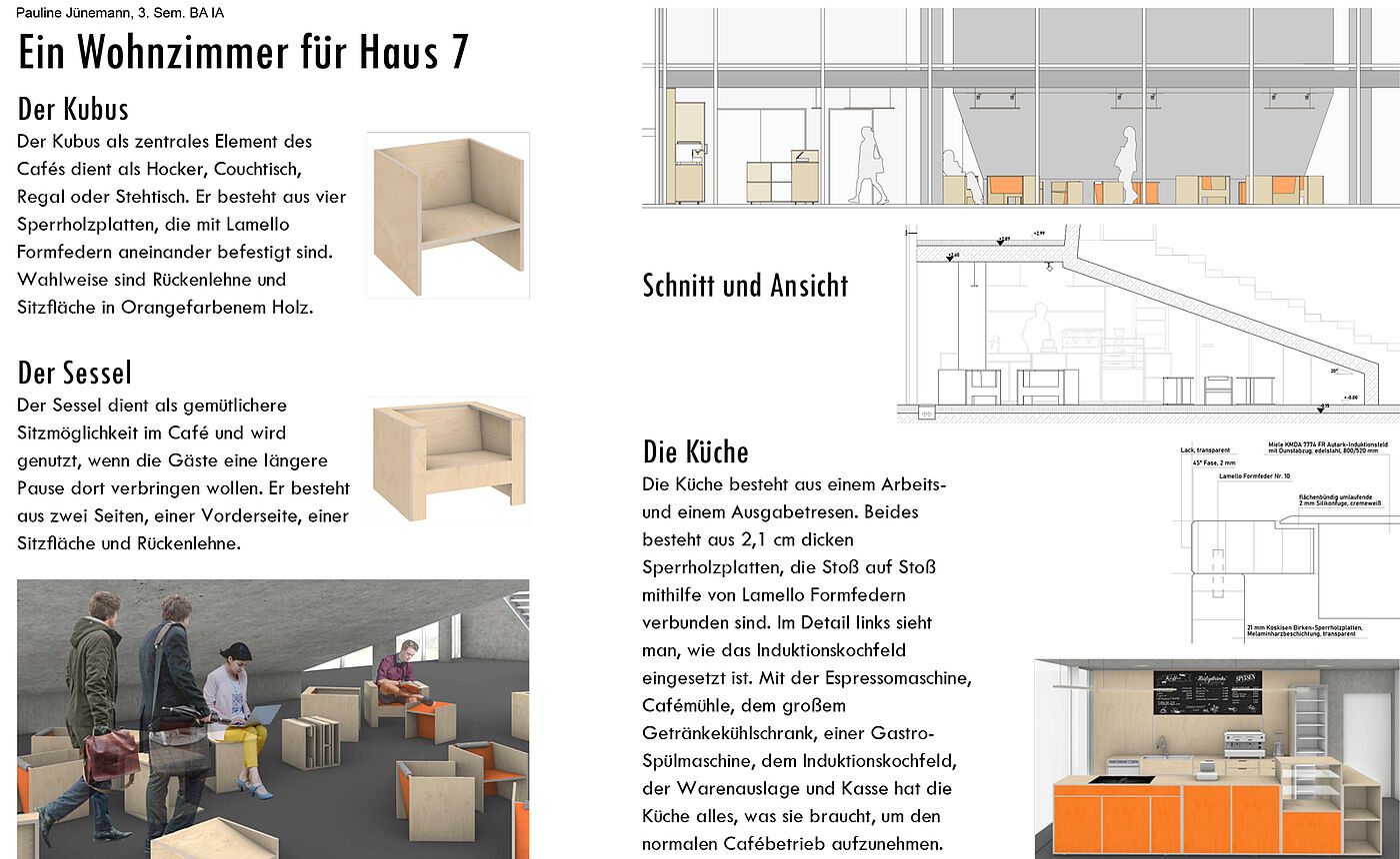 Not only the house number, but also the shape of the room served as the formal basis for the entire design. The faculty color orange is used as an accent color. The unconventional look creates a modern and at the same time rough impression.