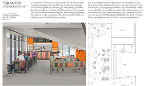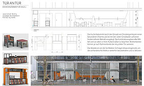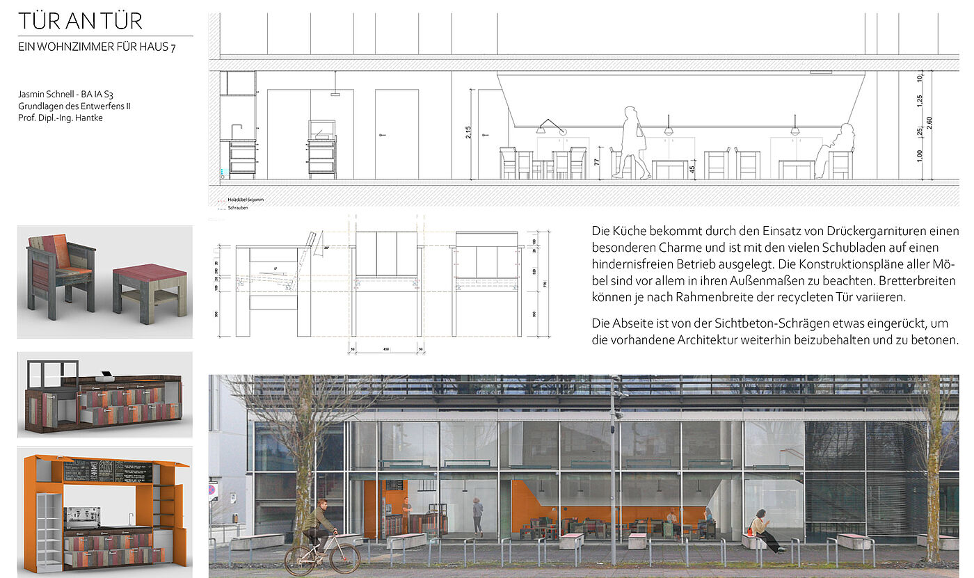 The increasing awareness of sustainability and the creativity of the faculty should be expressed through the upcycling of old doors, which thus form the seating and the counter. The frames and fillings are formally taken up and, together with the different surface colors and qualities, a motley »charm of the imperfect« is created.