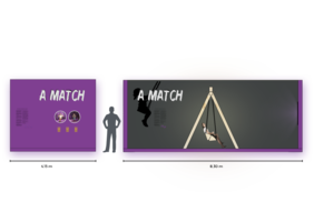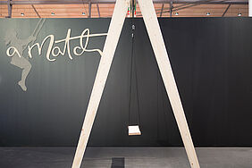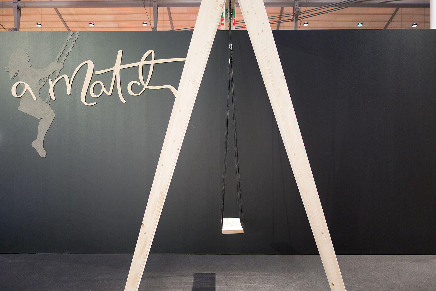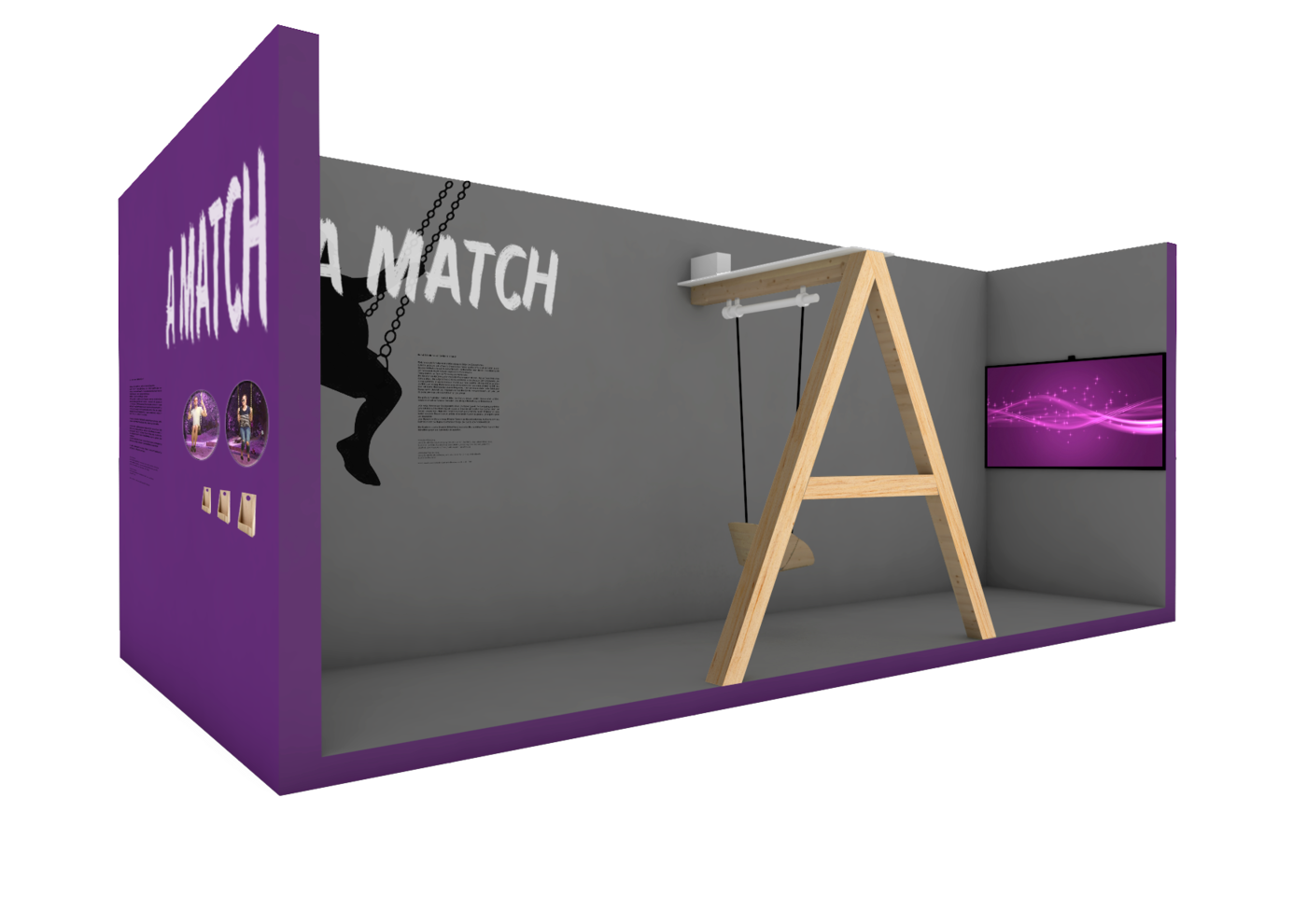 Zwei Menschen schaukeln miteinander, durch eine Wand getrennt, ohne dass sie sich dabei sehen können. Lediglich die Schwingung der Schaukelbewegungen wird auf einem Bildschirm als animierte Grafik angezeigt. Ziel des Spiels ist es auf die gleiche Wellenlänge zu kommen. Liegen beide Schwingungen übereinander, ist das Spiel gewonnen und es entsteht ein ‚match‘. In diesem Moment schaltet sich eine Frontkamera ein und zeigt die Liveübertragung des Schaukelpartners. Im Folgenden kann man über eine speziell für dieses Spiel entwickelte App Daten, wie Bilder, Grafiken, Analysen etc. abrufen und per Mail versenden. ‚A Match‘ nimmt einen plakativen Bezug zum Bodenthema der Messe, indem es die Menschen vom Boden abheben lässt. Doch durch die interakive Verbindung von Mensch zu Mensch - über eine Maschine und die anschließende Datenverarbeitung steht die Schaukel außerdem ironisch für das Menschenkaroussell Tinder.