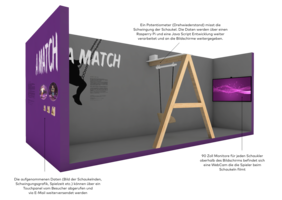 A Match ist ein Konzeptentwurf für ein Messeexponat auf der DOMOTEX Bodenmesse in Hannover. Durch die Kommunikation von Mensch zu Mensch, durch die Maschine entsteht eine interaktive Verbindung, die den Gedanken des Megatrends der Konnektivität aufgreift und somit den Bogen zum Leitthema der Messe (‚create’n’connect‘) schließt.
