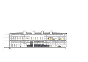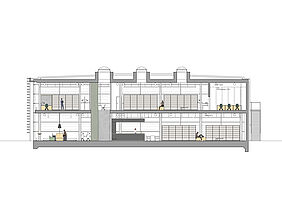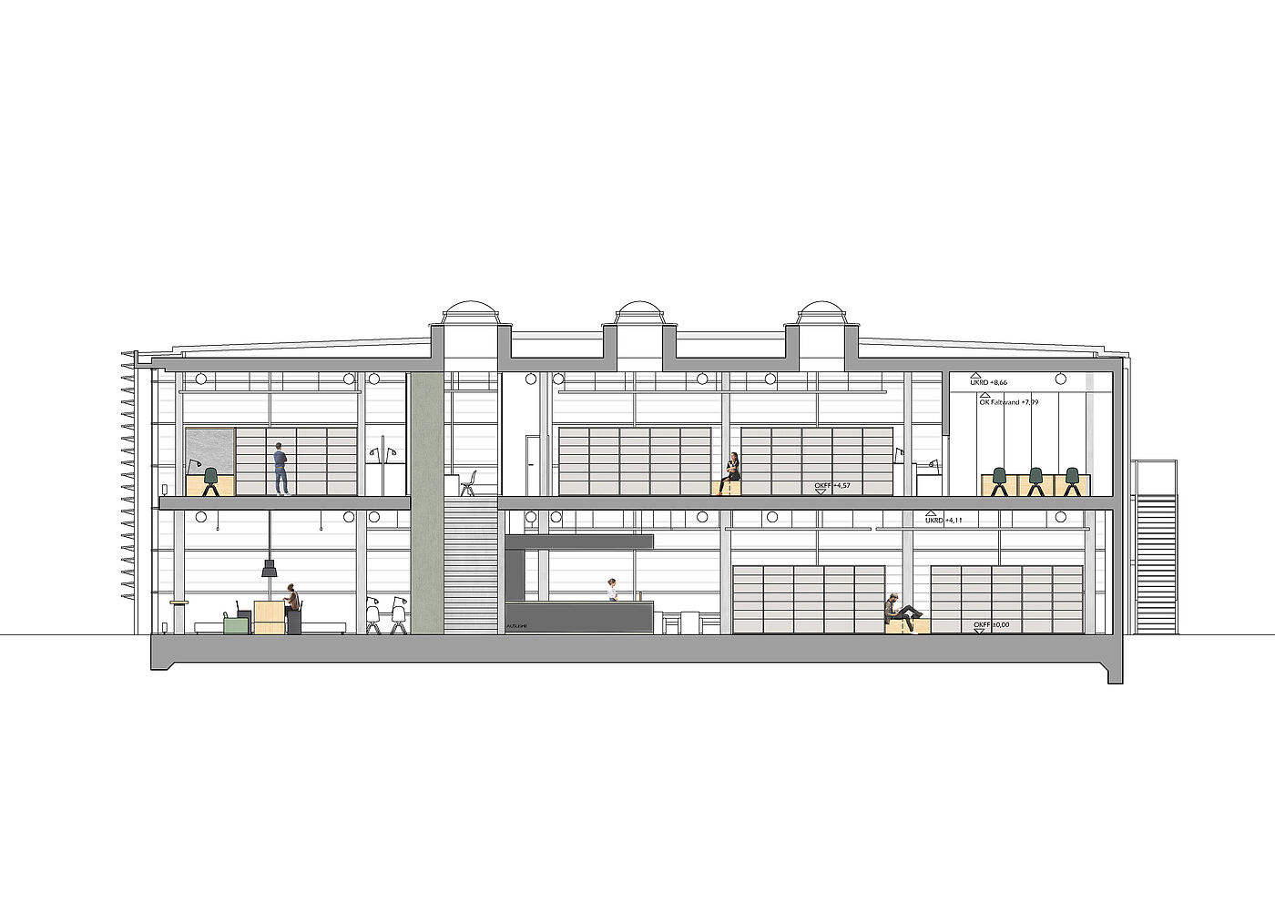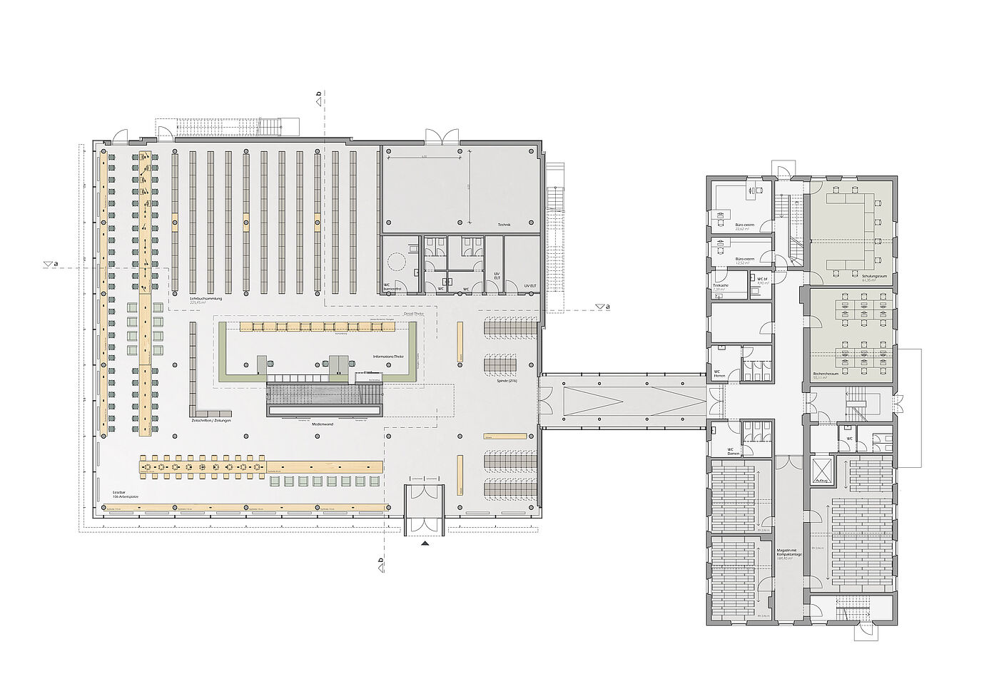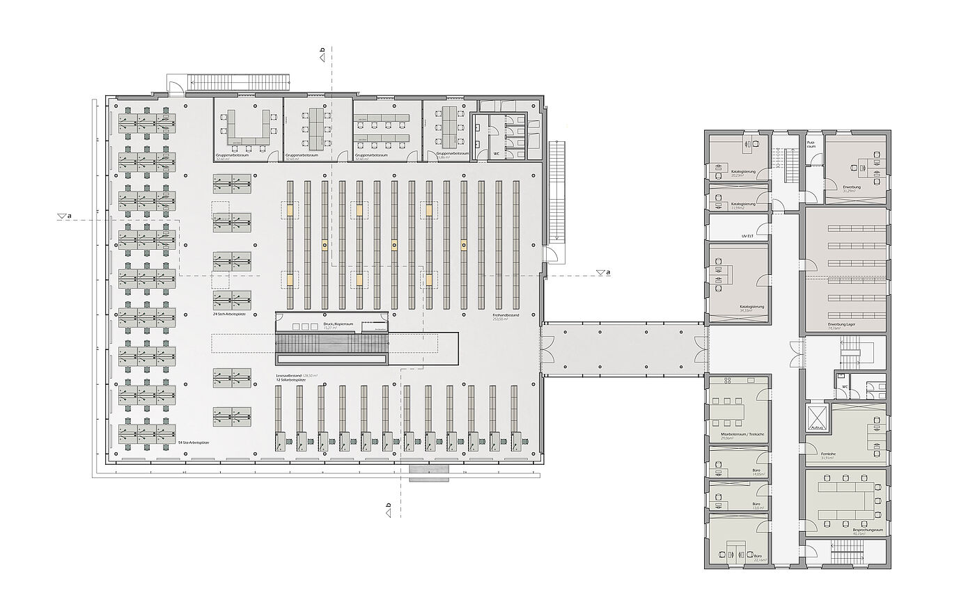 Die Innenraumzonierung folgt dem Kontrast der Fassadenausbildung: Arbeitsplätze befinden sich sowohl im Erd- als auch im Obergeschoss aussschließlich entlang der lichtdurchfluteten Glasfassade. Die Bücherbestände sind in den lichtärmeren Innenraumbereichen angeordnet.