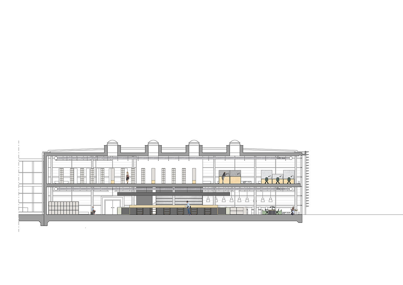 Die Lesebar im Erdgeschoss ermöglicht mit einer Aneinanderreihung unterschiedlicher Tischhöhen abwechslungsreiche Steh- und Sitzpositionen zum Arbeiten und lädt gleichzeitig zum kommunikativen Austausch ein.