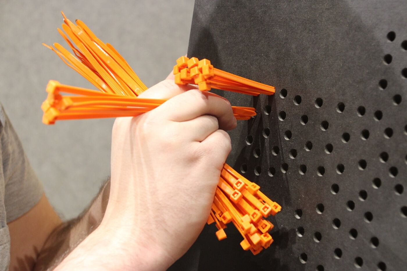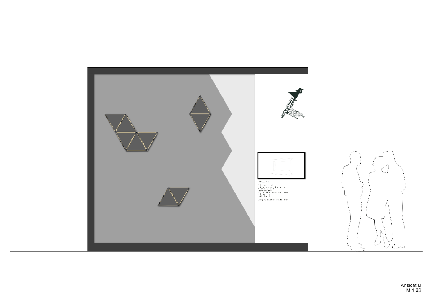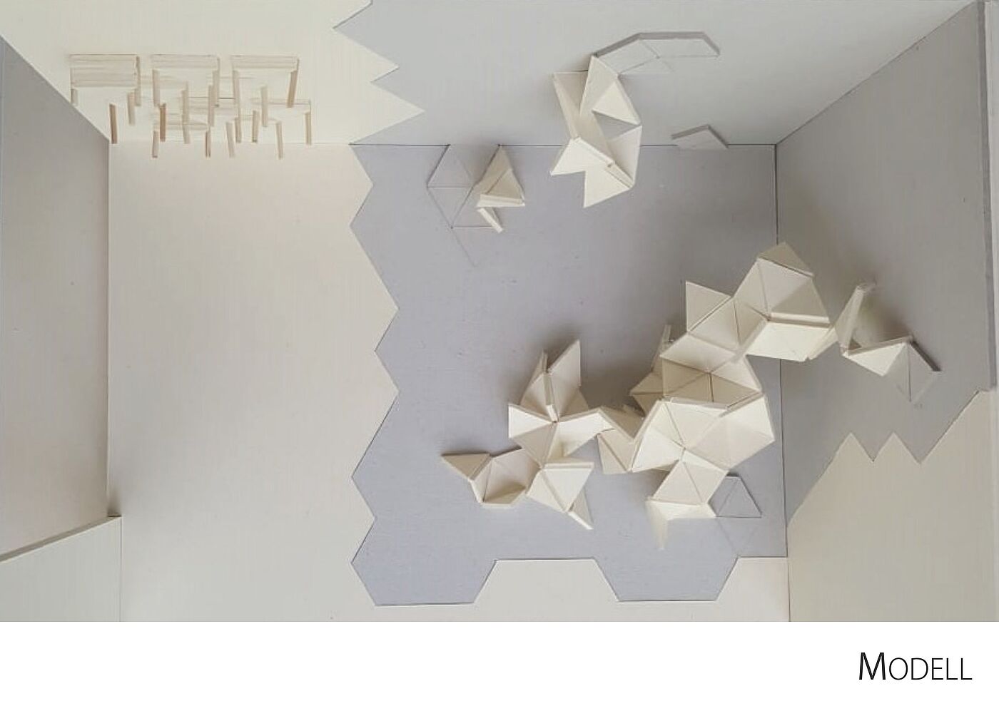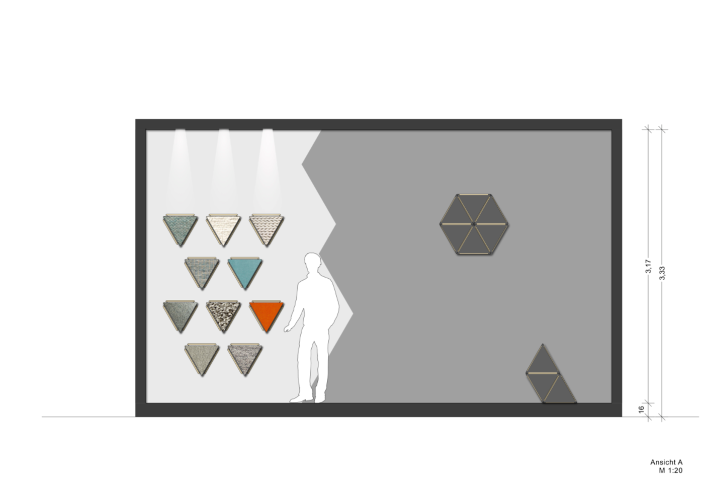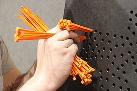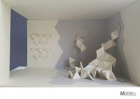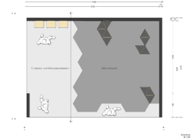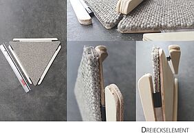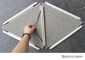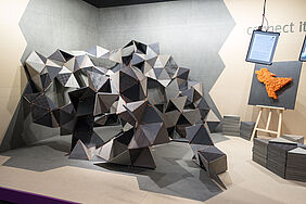Durch den Einsatz von gleichseitigen Dreiecken (á 40 cm) wird die Verknüpfung sichtbar. Das Dreieck hat an jeder Seite eine Lasche, die mit Hilfe von einem Gummiband an eine weiteren Lasche angeknüpft werden kann. Durch die Flexibilität der Lasche, kann dann das Dreieck beliebig an der Achse gekippt werden. Dadurch bilden sich dreidimensionale Körper und Formen im Raum. Ziel ist es, dass die Messebesucher, die den Stand besuchen sich ein Dreieck nehmen und es an ein weiteres anknüpfen – ihr Impuls könnte sein: Eine Materialkombination, eine spannende Form etc. Somit soll während der Messelaufzeit eine Raumskulptur entstehen, die stetig wächst, in sich immer stabiler wird und eine individuelle Gestalt annimmt. Auf dem Stand wird es zwei Bereiche geben: einen Funktionsbereich, indem die noch nicht verknüpften Dreiecke zu finden sind, und einen Aktionsbereich, indem die Dreieckselemente verknüpft werden.