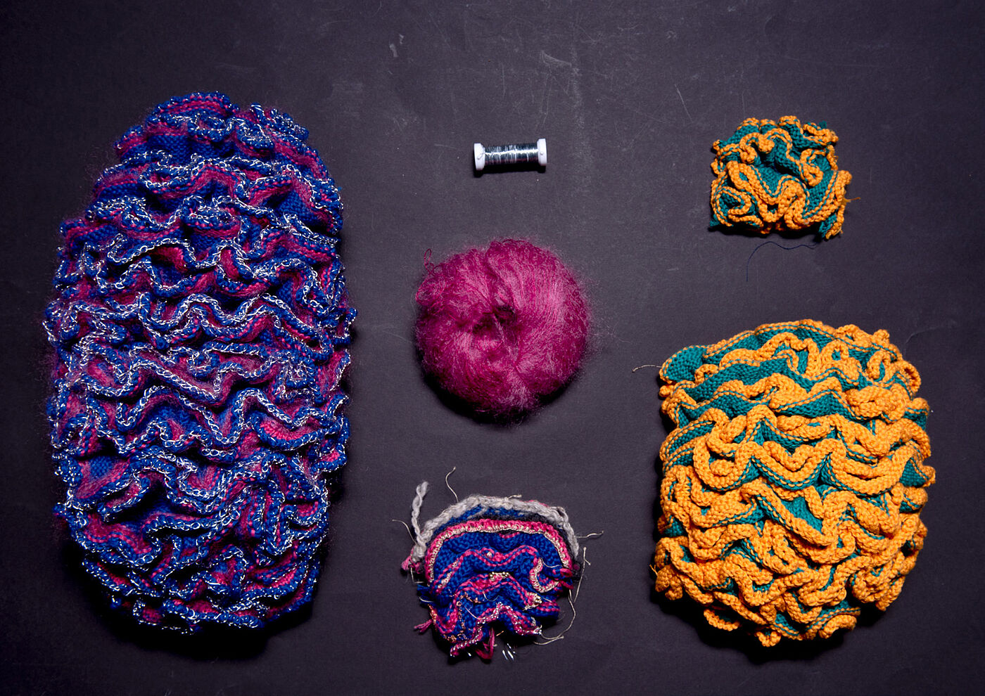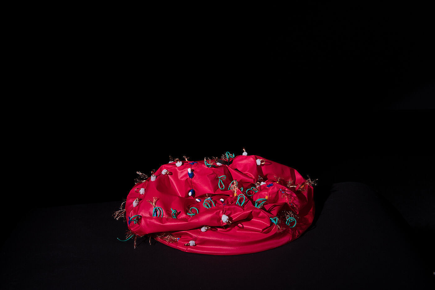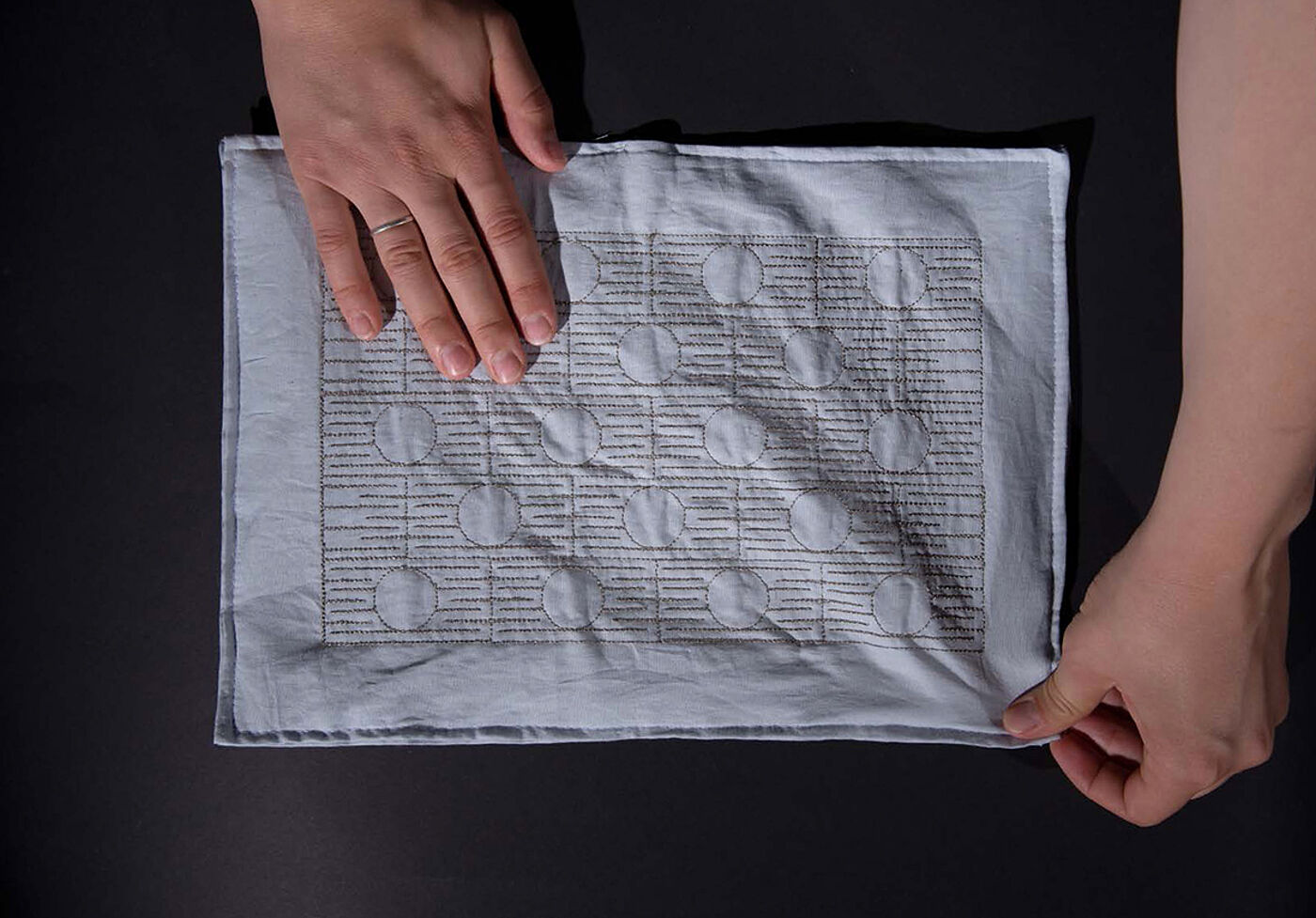 Vier textile Objekte, jeweils inspiriert von einem täglichen Handgriff, den wir mit Textilien verbinden. Sie nehmen Bezug auf körperliche und soziale Aspekte des Berührens, indem sie einerseits visuell anziehend wirken und andererseits auf Berührung unerwartet, teils laut und sichtbar, teils subtil reagieren. Textilien und Code sind zwei Bereiche, die geschichtlich betrachtet eng miteinander verwoben sind, heute jedoch häufig sehr getrennt betrachtet werden. Dies hat viel mit andauernden Geschlechtsvorstellungen und der gesellschaftlich verankerten Hierarchie von Handarbeit und Technik zu tun. Dieses Projekt ist der Versuch einer reflektierten Kombination von textilen Materialien und elektronischen Komponenten, um zu erforschen, welche Möglichkeiten darin stecken. Dabei liegt das Augenmerk nicht nur auf neuen Ansätzen bei der Interaktion zwischen Mensch und Technik, sondern auch auf den potenziellen inhaltlichen Auswirkungen einer größeren Durchmischung beider Bereiche. Rebekka Jochems Objekte untersuchen die Anziehungswirkung von Oberflächen, die berührt werden wollen oder zumindest taktile Reaktionen provozieren sollen. Immer unter den Fragestellungen: Warum möchte ich es anfassen? Wie berühre ich etwas? Darf ich es berühren? Überschreite ich eine Grenze? Welche Folgen hat mein Handeln? Anhand der vier alltäglichen Handlungsweisen – des Anfassens, des Bedeckens, des Kraulens oder Streichelns und des Zerknitterns werden subtil verschiedene Formen des Berührens erforscht. Die Objekte versuchen durch ihre verborgene Funktionalisierung für kurze Zeit den Berührenden, die Kontrolle über die sich verändernde Situation zu nehmen – nach der Berührung merke ich, dass ich eine Veränderung verursacht habe, derer ich mir vorab nicht bewusst war.