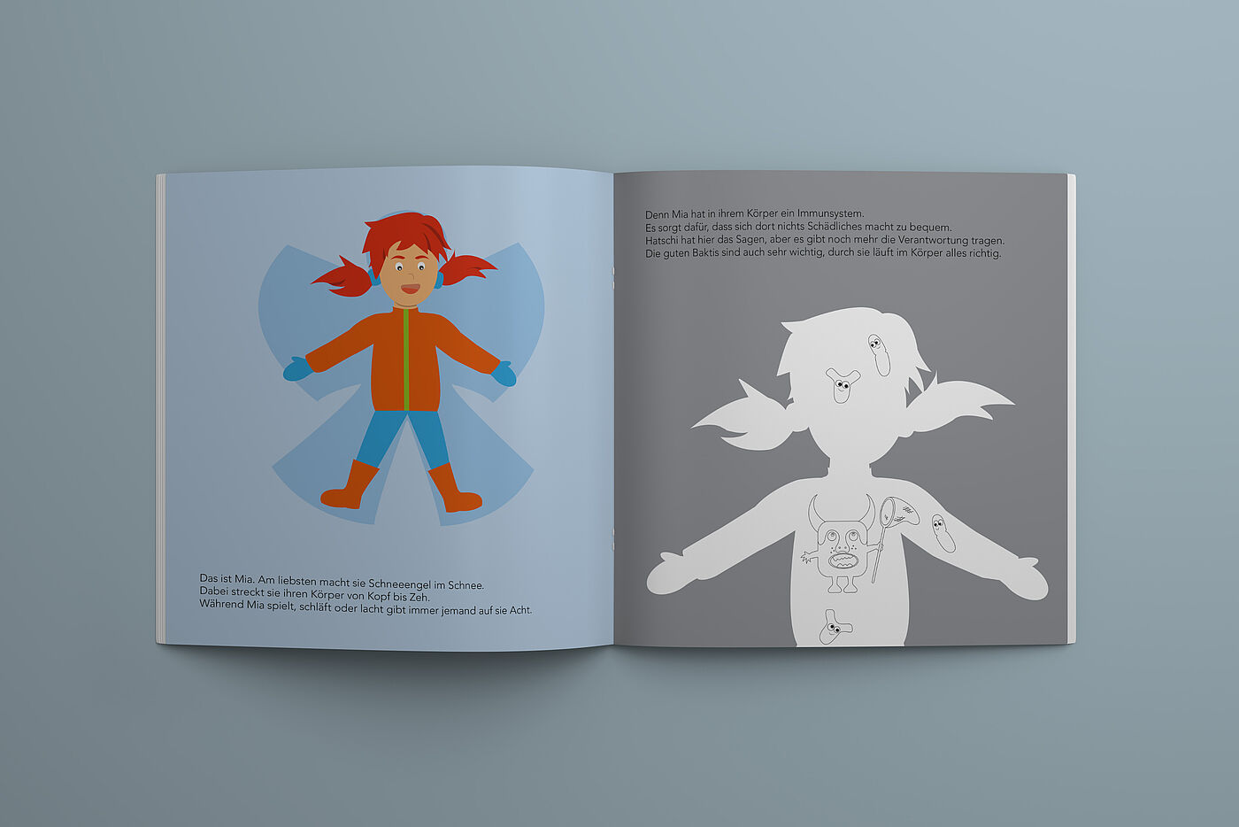 In dem Ausmalheft wird die Geschichte von Hatschi und Mia erzählt. Hatschi ist eine Symbolfigur eines fast schon mit Superkräften ausgestatteten Immunsystems und unterstützt das natürlich im Körper existierende Mikrobiom. Das besteht aus „guten“ Bakterien, die zum Beispiel dafür sorgen, dass organische Prozesse wie Stoffwechsel und Verdauung funktionieren, die unsere Haut schützen und schädliche Bakterien in Schach halten. Das Immunsystem ist in der Lage, zwischen diesen lebenswichtigen („guten“) Bakterien und schädlichen Krankheitserregern (Viren und „böse“ Bakterien) zu unterscheiden.
