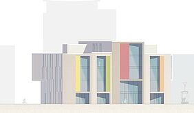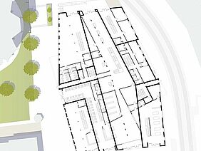 Kennzeichnend für diese Arbeit ist die Wahl einzelner Baukörper, die sich wie Puzzleteile zu einem großen Ganzen zusammenfügen. Dadurch werden Relevanz und Stellung der einzelnen Komponenten im Gesamtbild betont. Gleichzeitig haben die Baukörper dadurch weder Vorder- noch Rückseite, jede Seite ist gleichermaßen Vorderseite. Mithilfe individueller Zugänge wird jedem Baukörper die Kommunikation mit der Umgebung ermöglicht. Innerhalb dieser Bebauung entsteht eine Kultur- und Literaturlandschaft, die unterschiedliche Flächen für Bibliothek, Ausstellungen, Veranstaltungen und gastronomische Einrichtungen miteinander kombiniert.