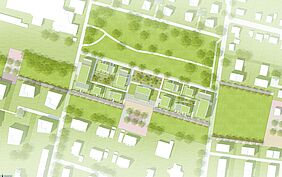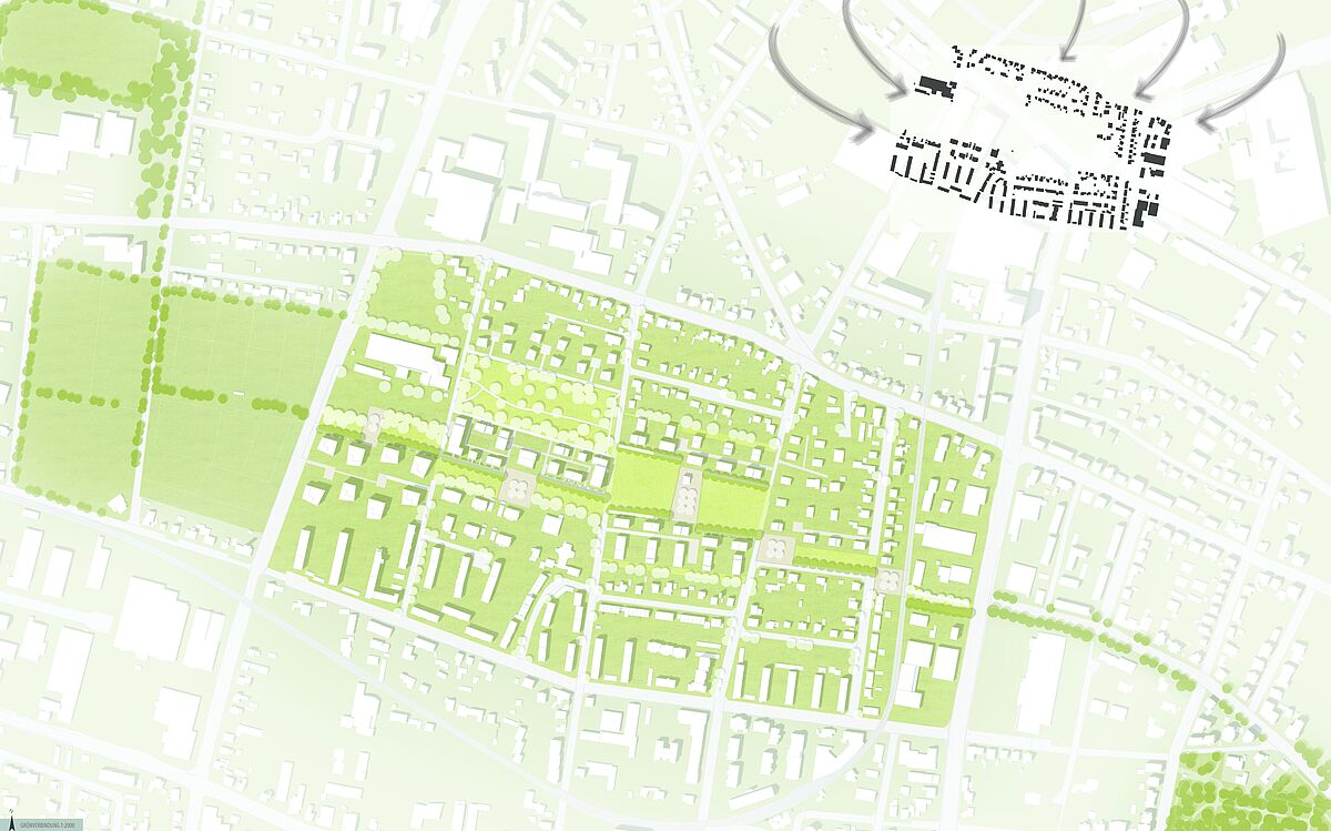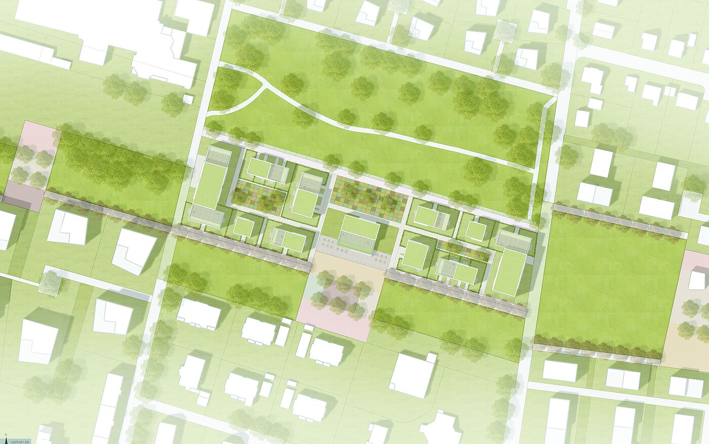 Durch Vor- und Rücksprünge der bestehenden Baufelder und der Wiederaufnahme in den Neubaufeldern entsteht sowohl ein Rhythmus in der Landschaftsachse als auch in der Bebauungsstruktur. An der Kante dieser Achse entstehen Geschosswohnungsbauten, welche den Effekt der Linking Lines in die Höhe verstärken. Dort, wo die Kanten verspringen, entstehen urbane Räume, Raumaufweitungen und Plätze, die sich von der grünen Achse abheben. Durch die Kombination unterschiedlicher Freiraumtypologien – grüne Wiese und unterschiedlich bespielte Plätze zwischen den Grünräumen – entstehen dysfunktionale, vielfältig interpretierbare Räume sowohl für die junge als auch die ältere Generation im Quartier.