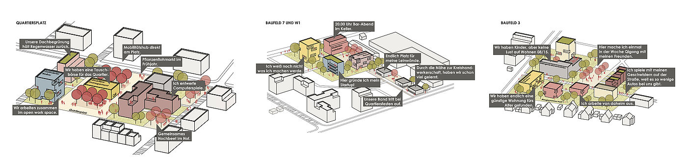 Im Rahmen der Konzeptvergabe beurteilt die Stadt mit einer Fachjury die Gesamtidee sowie die vorgeschlagenen Konzepte für jedes Baufeld anhand verschiedener Kriterien mit Wertungspunkten. Ist eine gewisse Mindestpunktzahl pro Baufeld erreicht, darf das Konzept in der vorgeschlagenen Art umgesetzt werden. Der vorgestellte Entwurf zeigt nur eine von vielen möglichen Spielvarianten, überzeugt jedoch in seiner beispielhaften Konzeption mit ausgeprägten stadträumlichen Qualitäten, die eine sinnvolle Adaption des „Spiels“ für andere Stadträume erwartbar darstellen. Jedes Baufeld ist mithilfe der Anwendung des Spielprinzips variabel in Typologie, Nutzung, Qualität der Außenräume etc. und ermöglicht im vorliegenden Fall ein Miteinander von Wohnnutzungen und Arbeitswelten. Es kommt so zu einer Mischung der Bewohner und ihrer Lebenssituationen – unter Wahrung hoher stadträumlicher Qualitäten werden die Bauwerke zum Ausdruck einer sozialen und kulturellen Vielfalt.