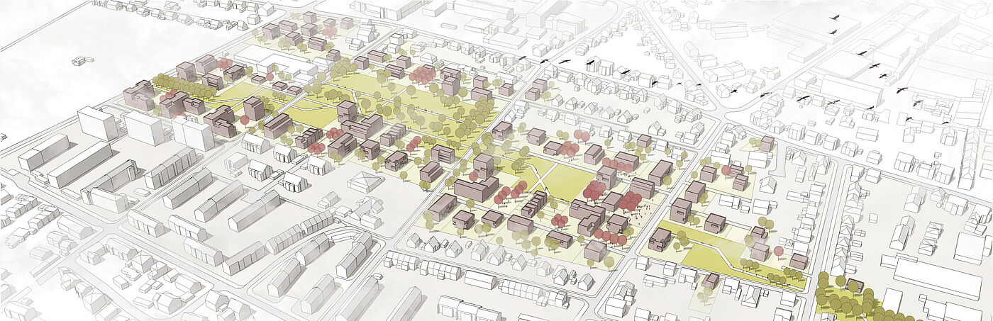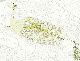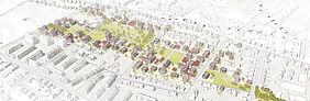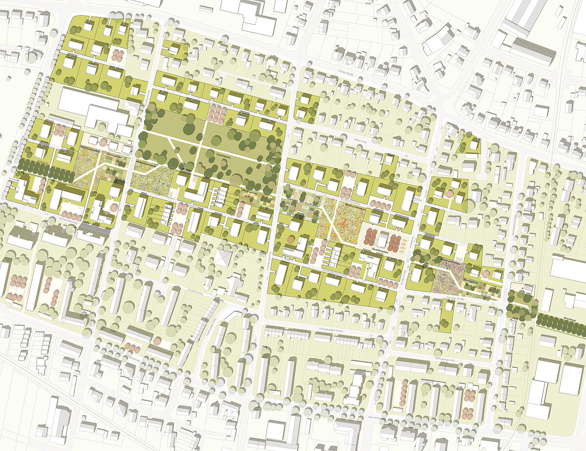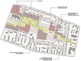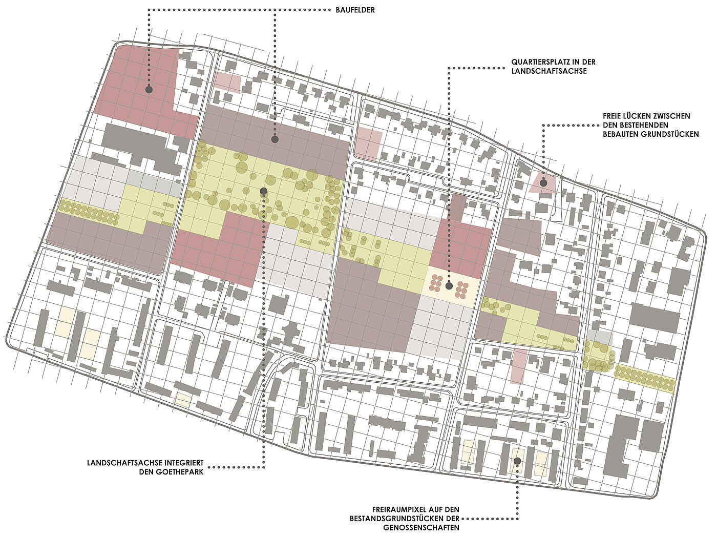 Das „Spielfeld“ besteht aus einer festgelegten übergeordneten Landschaftsachse und diversen definierten Baufeldern. Diese Baufelder bilden die im Spiel zu füllenden „Pixel“. Ferner bestehen ebenfalls auf den Bestandsgrundstücken vereinzelte „Pixel“, um die vorhandenen Freiräume in diesen Bereichen aufzuwerten. Die Landschaftsachse wird in ihrer äußeren Form durch die „Pixel“ gebildet und enthält auf zusammengefassten großen Pixeleinheiten bestimmte Typologien und Nutzungen. Schwerpunkte dieser Nutzungen sind bspw. der vorhandene Goethepark sowie ein Quartiersplatz.
