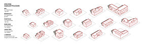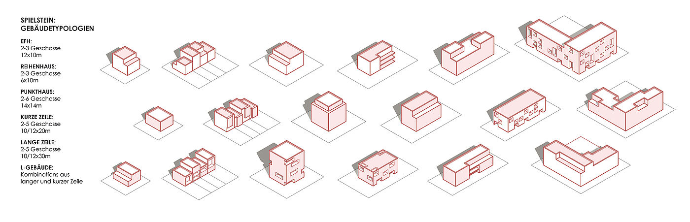 „Spielsteine“ stellen die Bebauungs- und Freiraumtypologien dar, deren „Pixel“ unterschiedlich ausgeprägt sind. Die Gebäude sind festgelegt auf sechs Typologien: Einfamilienhaus, Reihenhaus, Punkthaus, lange und kurze Zeile sowie L-Gebäude. Zusätzliche Bausteine bilden Werkstätten, Ateliers oder Proberäume. Die „Freiraum-Spielsteine“ gibt es in verschiedenen Größen, die im Laufe des Spiels dynamisch angepasst werden. Pro Baufeld ist mindestens ein „Freiraum-Spielstein“ vorzusehen, der als Treffpunkt für die Nachbarschaft auf dem Baufeld gilt. Der „Freiraum-Spielstein“ wird als erstes auf dem Baufeld verortet, die genauen Maße werden aber erst im Laufe des Entwurfsprozesses festgelegt. Die Gebäude sind aus den vorgegebenen Typologien vorzuschlagen und am Grundraster zu orientieren.