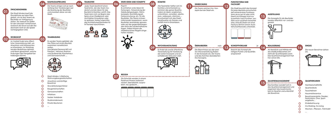 Statt eines Masterplans, der top-down entwickelt wird, ist der vorgeschlagene Quartiersentwurf vielmehr ein bottom-up-Prozess, der das spätere Zusammenleben fördern soll. Um die „Pixel“ möglichst vielfältig umzusetzen, bedarf es unterschiedlicher Teilnehmer und kreativer Köpfe, die das Quartier gestalten. Für die Umsetzung des Entwurfs wird daher das Prinzip der Konzeptvergabe vorgeschlagen. Die Stadt Minden soll weder die exakte Bebauung vorgeben noch ein spezielles Nutzungskonzept. Jedoch werden klare Rahmenbedingungen definiert, damit ein qualitätvolles und identitätsstiftendes Quartier entsteht. Um dabei einerseits alle Stakeholder zu koordinieren und andererseits die Rahmenbedingungen einzuhalten, wandelt sich der gesamte Entwurf in ein Spiel mit einem städtebaulichen Regelwerk. Alle Teilnehmer sind aufgefordert, die freien Flächen mit Ideen, Konzepten und Leben zu füllen. PIXEL IT!