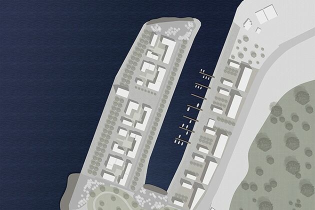 Die Gegensätze "Dichte und Offenheit" sowie "Hart und Weich" werden Grundlage des Entwurfsprinzips. Einen besonders hohen Stellenwert erhält die Promenade an der westlichen Kaikante, die sehr breit ausgeführt wird und eine Flaniermeile an der Förde darstellt. Die vorhandenen Speicher und die nördliche Hafenspitze werden in die Promenade integriert, wodurch diese zugleich ihre Struktur erhält. Auf der Grundlage der zentralen Themen sind die Baufelder von dichter Bebauung geprägt und weisen einen urbanen Charakter auf. Durch die aufgelöste Blockstruktur entstehen gleichzeitig private Grünflächen im Inneren. Ein weiteres zentrales Element im Entwurf verkörpert der weitläufige Park, dessen organische Form im direkten Kontrast zu der harten Struktur der Baufelder und deren Freiraumgestaltung steht.