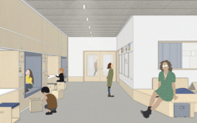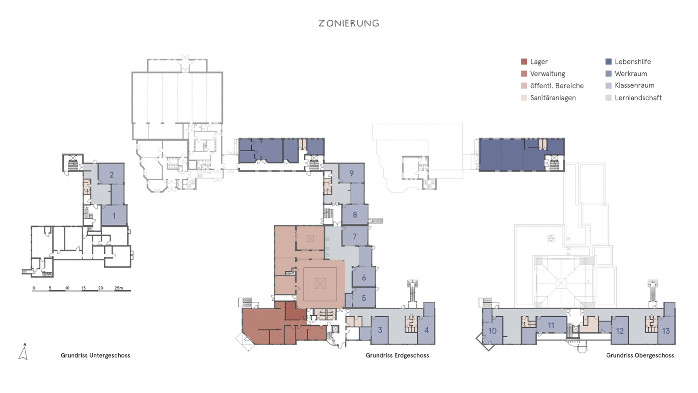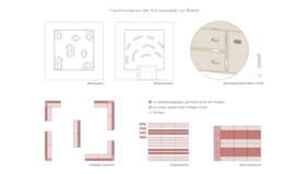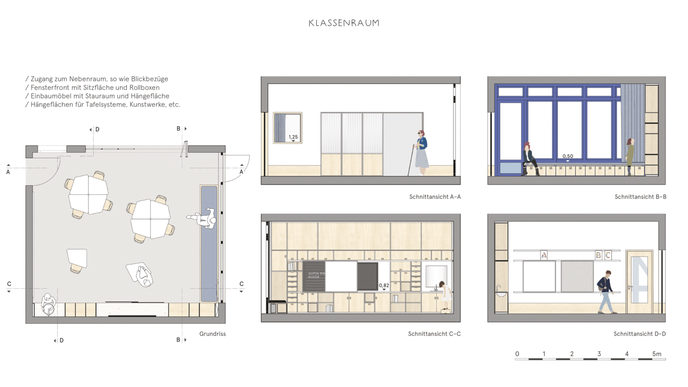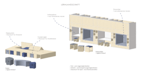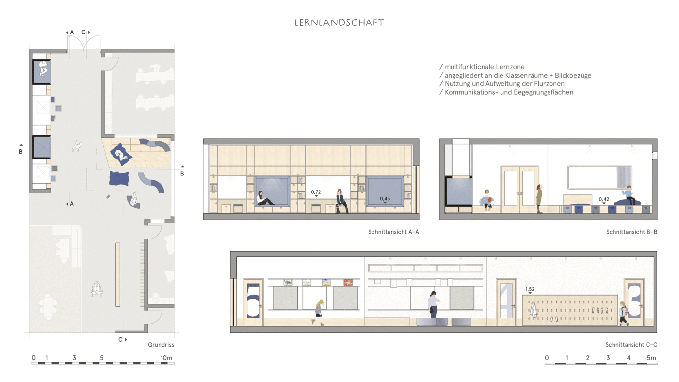 In our design concept, we have dealt with how children want to learn, what requirements there are specifically on the premises of the Papenmoor Support Center and how we can embed a contemporary school concept in the existing support school. The most important points for us were on the one hand to add an adjoining room to each classroom in order to meet the need to divide the class or separate individual students from the large group. On the other hand, to use and expand the corridor zones and thus generate expanded teaching and learning areas in which the pupils have more freedom of choice as to how they want to learn. This is made possible by offering a wide variety of seating and reclining options. In each case one classroom between two others gives way to widen the corridor zone, so that learning landscapes or, in some cases, adjoining rooms can be generated. Furthermore, it was important to us to make the classrooms more flexible and quieter, so that there is no need for additional concentration, fading out a visually stressful environment and an easier change from group and individual work or from frontal input lessons to other forms, such as meetings is possible in a circle of chairs. The atrium should be able to develop its full spatial potential and will become the heart of the school in that all communal areas are attached to it. The teaching kitchen with café and kiosk, as well as the leisure room, are now adjacent to the atrium and can be expanded with folding walls so that a flowing space can be created in the middle of the school. This transparency and openness is also continued in the rest of the building. Visual references and visual relationships are thus possible between different areas.