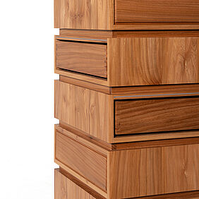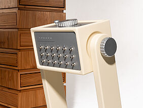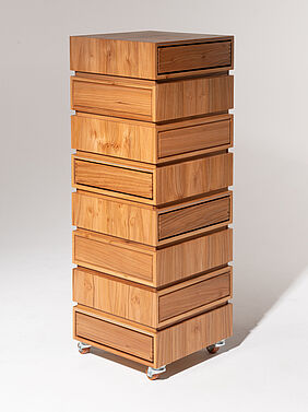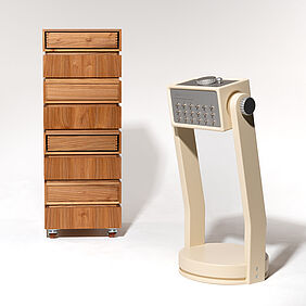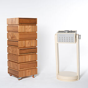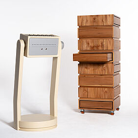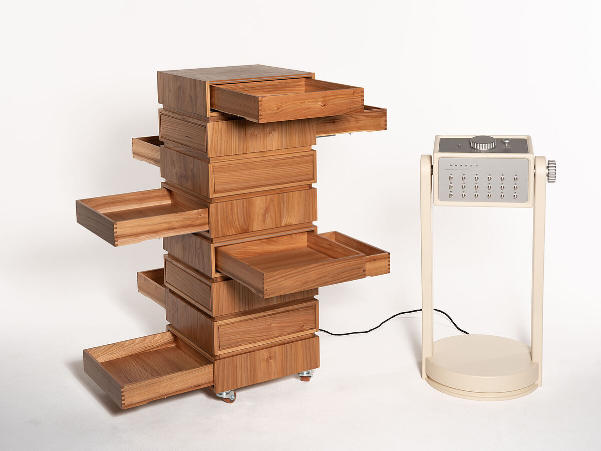 Das Archiv verwandelt das Speichern und Wiederfinden von Erinnerungen in einen bewussten, körperlichen Akt. Es besteht grundlegend aus zwei Objekten, einem klassischen Aufbewahrungsmöbel aus Ulmenholz – einem Holz, das in der Industrie ein wenig in Vergessenheit geraten ist – und einer Konsole mit Rätselmodulen, die gelöst werden müssen. In dem Archiv werden Gegenstände gespeichert, die man mit Erinnerungen verbindet und die Konsole dient als Schlüssel um sie zu öffnen. Auf unterschiedlichen Ebenen sind, wie in einer Art Datenbank, Schubkästen wie Speicherslots angebracht. Sie sind zunächst versperrt und brauchen die Lösung aller Rätsel, damit sie sich öffnen. Weil nichts von außen anzeigt, was sich im Inneren verbirgt, muss man sich also merken, welche Erinnerung wo abgelegt wurde. Das verlangt Aufmerksamkeit und macht den Zugriff zu einem bewussten Akt. Um zusätzliche Interaktion einzufordern sind die Schubkästen versetzt angeordnet, sodass man um das Objekt herum gehen, oder es drehen muss. Das Lösen der Rätsel dauert ebenfalls seine Zeit, wobei es auch gewollt ist, dass man ein paar Minuten mit ihnen verbringt, um dann letztendlich an den eigentlichen Inhalt heran zu kommen. Das kann man auch als Metapher für die Entstehungsgeschichte solcher Erinnerungen sehen, weil eben bestimmte Prozesse passieren mussten, die zu diesem Moment im Leben geführt haben. Alles hat eine Vergangenheit, einen Weg den man erst gehen musste. Man kann es auch umdrehen und sagen: je nachdem in welcher Lebensphase man sich grade befindet, gibt es tief verborgene Fragmente, die einen Auslöser - die Rätsel - brauchen damit man sich wieder an sie erinnert.
