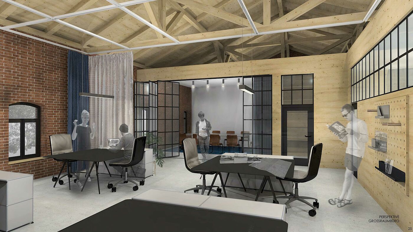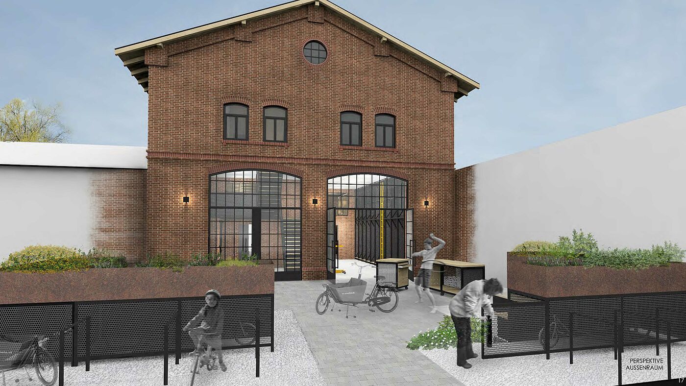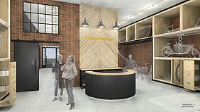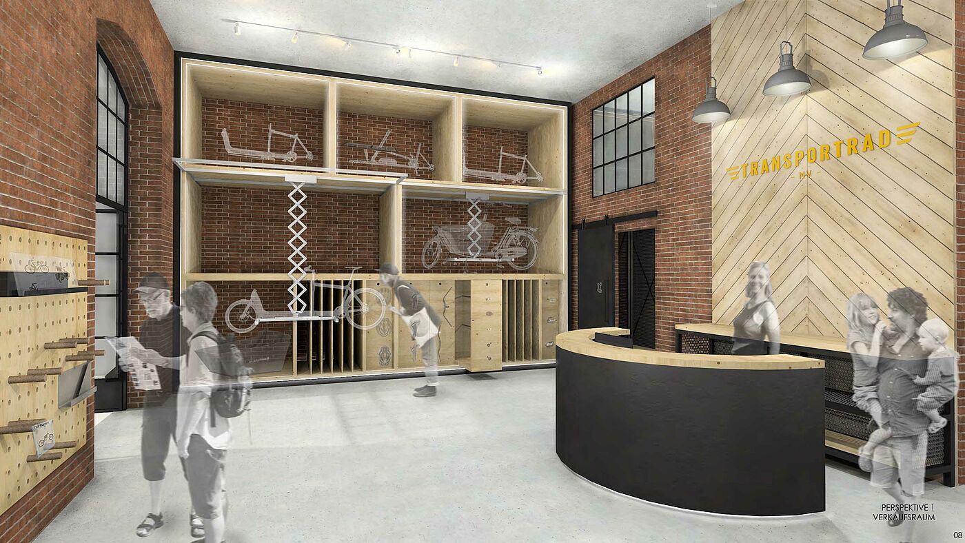 For the young Rostock based transport bike shop “transportrad-mv”, a shop concept was to be developed for the Schwerin location at the train station. The former depot in Schwerin will be converted into an urban center in the long term. In addition to cultural institutions, a publishing house and gastronomy, the location close to the center now also offers the Rostock company “Transportrad-mv” a location to offer cargo bikes in Schwerin. In addition to the classic sale of cargo bikes, the integration of a cargo bike rental company and office space that should be available as co-working for the shop operator and for the ADFC were part of this design.