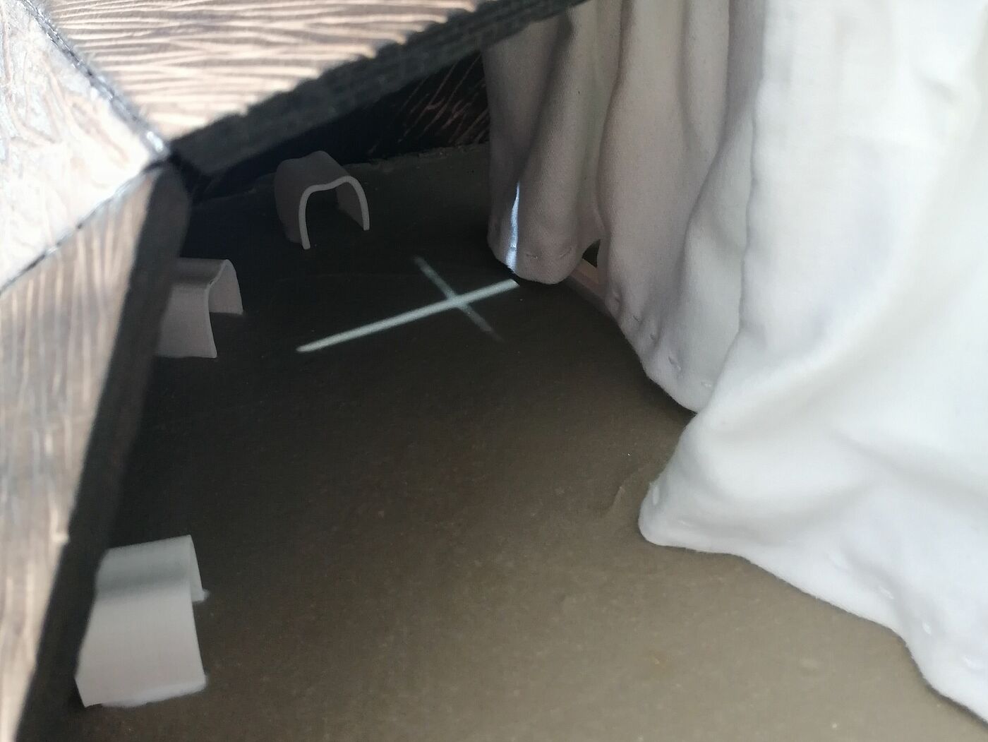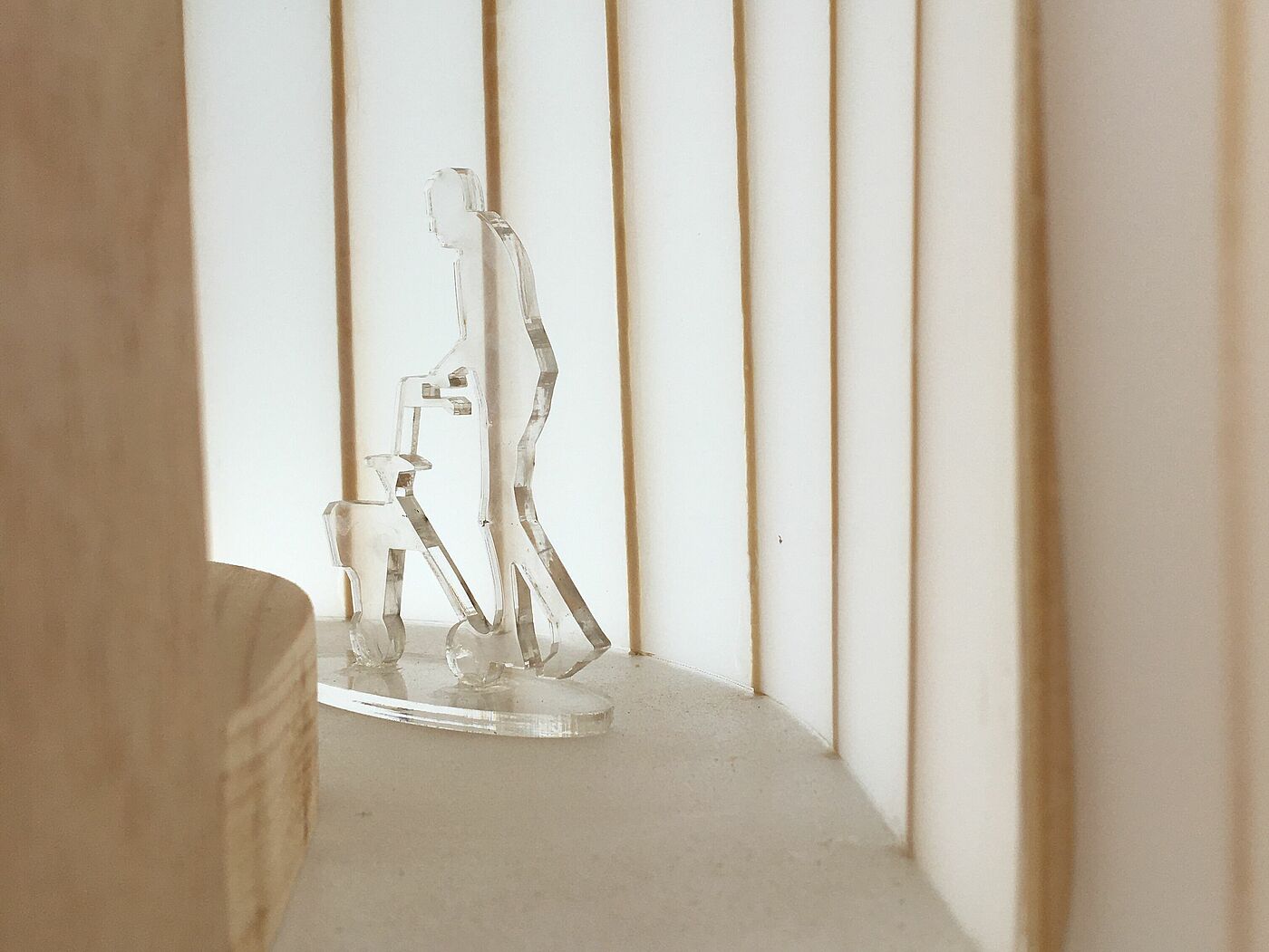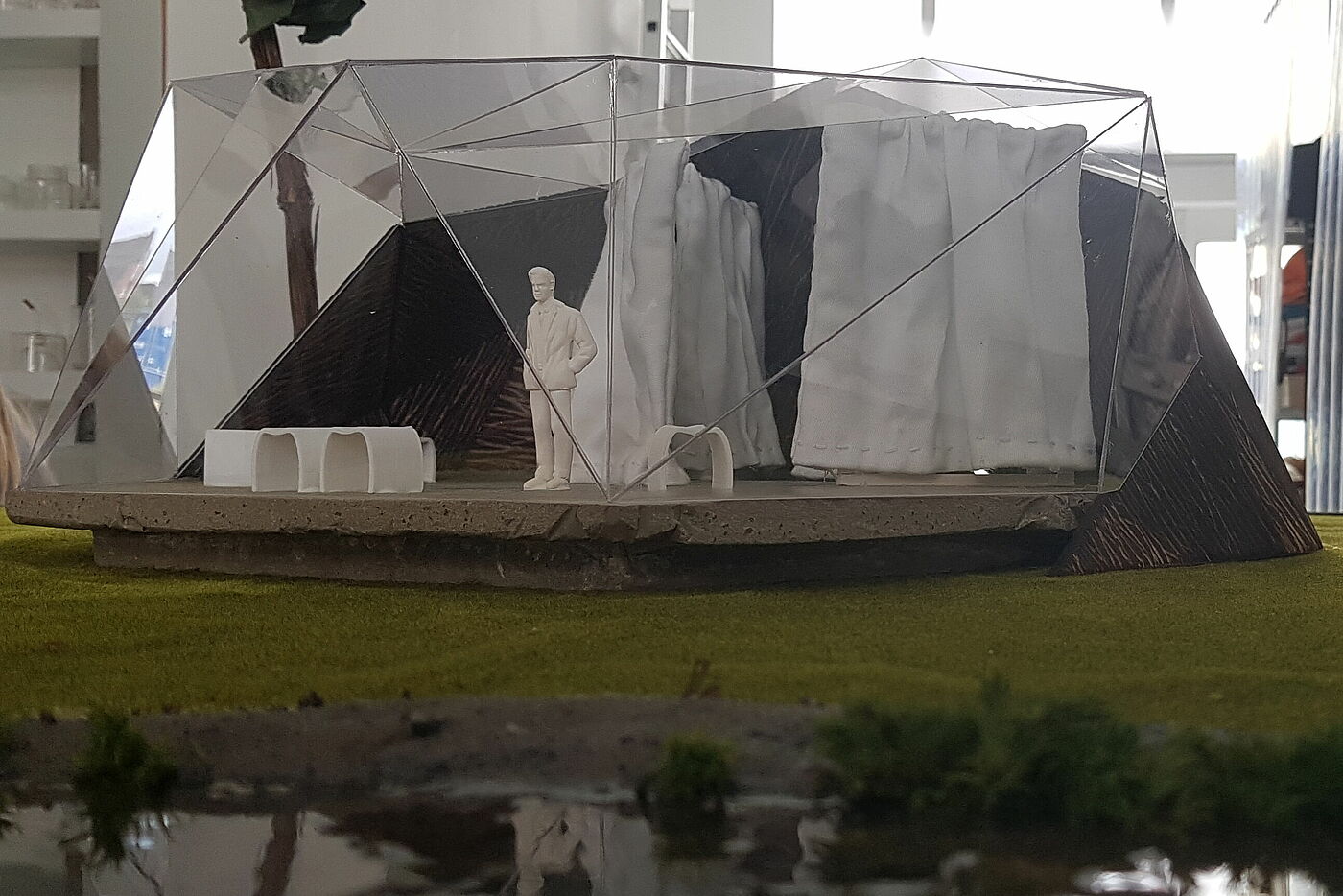 The construction made of poplar bark, acrylic glass and concrete is located at the Ziegeleiteich in the Pansevitz cemetery forest on the island of Rügen. The stages of mourning are illustrated by four large, white fabric sculptures that are attached to wooden frames and fall freely to just above the ground. The fabric is opaque, as is the threshold between life and death. A special feature is the narrow cross in the outer shell that casts light on one of the fabric sculptures at midday.