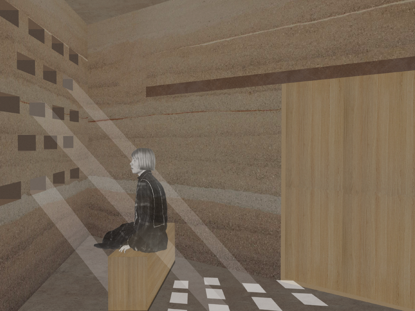 The pavilion is a piece of nature. Its walls, floors and ceilings are made of rammed earth, which could gradually become part of nature again. The rammed earth gives the pavilion a massive appearance, which, however, does not take attention away from nature, but rather appears as part of the environment.