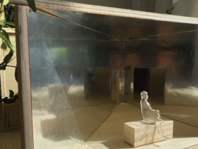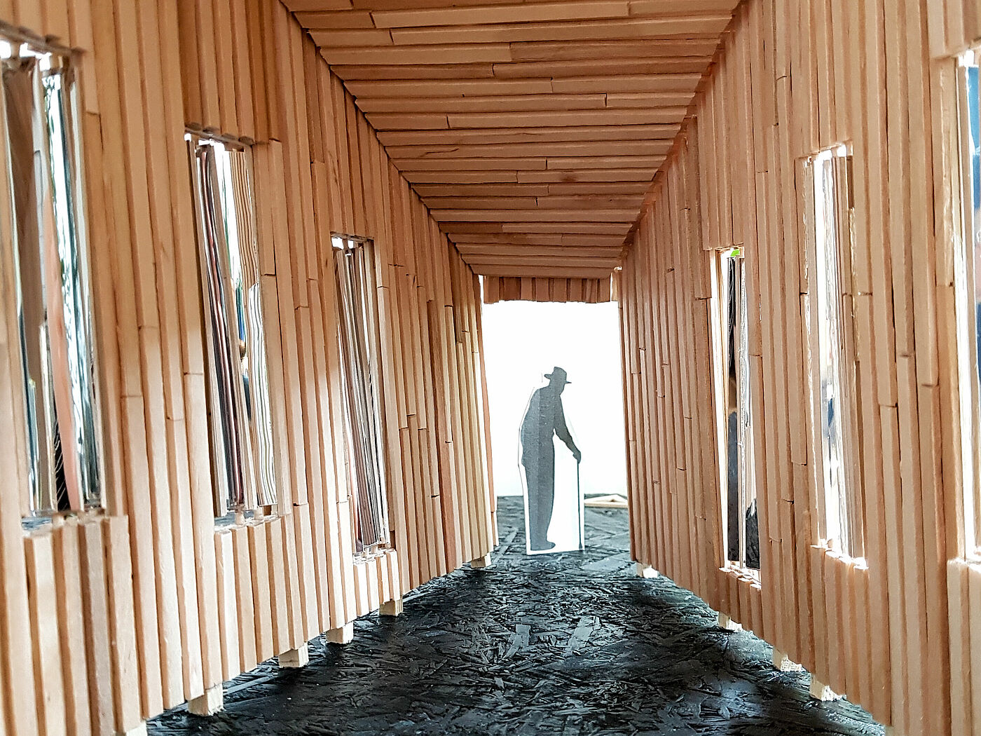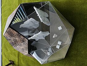 When walking through, the visitor is not only surrounded by closed walls but also by mirrors that bring the surroundings from the outside to the inside and allow completely different perspectives. The mirrors are rotatable and invite everyone to experiment and catch different perspectives again and again.