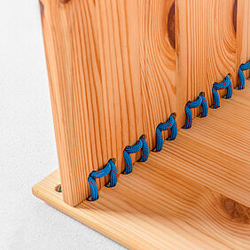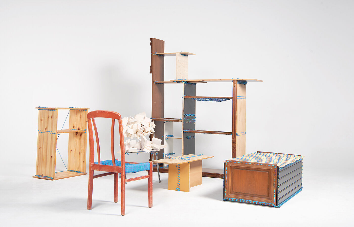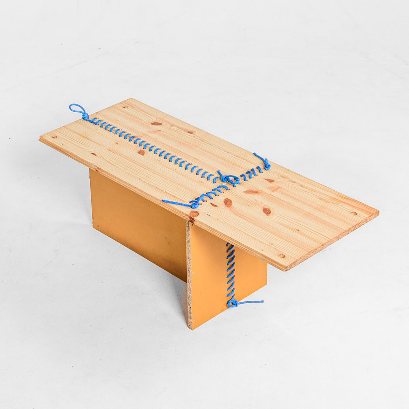Das Konzept des Möbelprinzips zeigt einen alternativen Herstellungsprozess, der unabhängig von industriellen Produktionsprozessen funktioniert. Als Verbindungselement dient ein belastbares Seil, das nach Belieben offen gezeigt werden kann. Die Platten werden miteinander vernäht, um dieses Verbindungsprinzip auf unterschiedlich große Platten anwenden zu können.