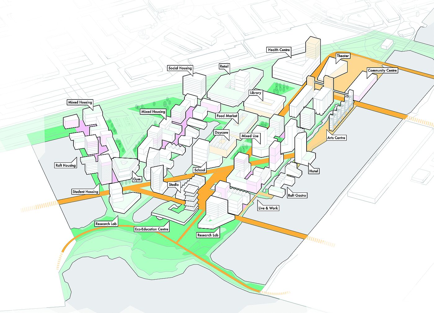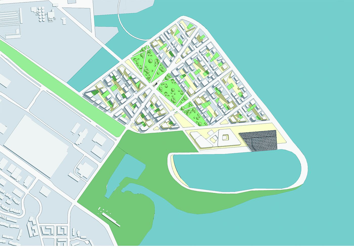 The projects considered both higher-level contexts and the analysis of the site. In addition to the analysis and presentations of historical and contemporary case studies - significant in terms of urban planning and architecture - discussions were held to classify and evaluate what has been seen. The aim of the urban and landscape design with an architectural design project of choice was to open up development potentials, to link fragmented areas with each other, to activate area potentials as well as to develop suitable public space and building typologies in dealing with the special features of the location next to the water.