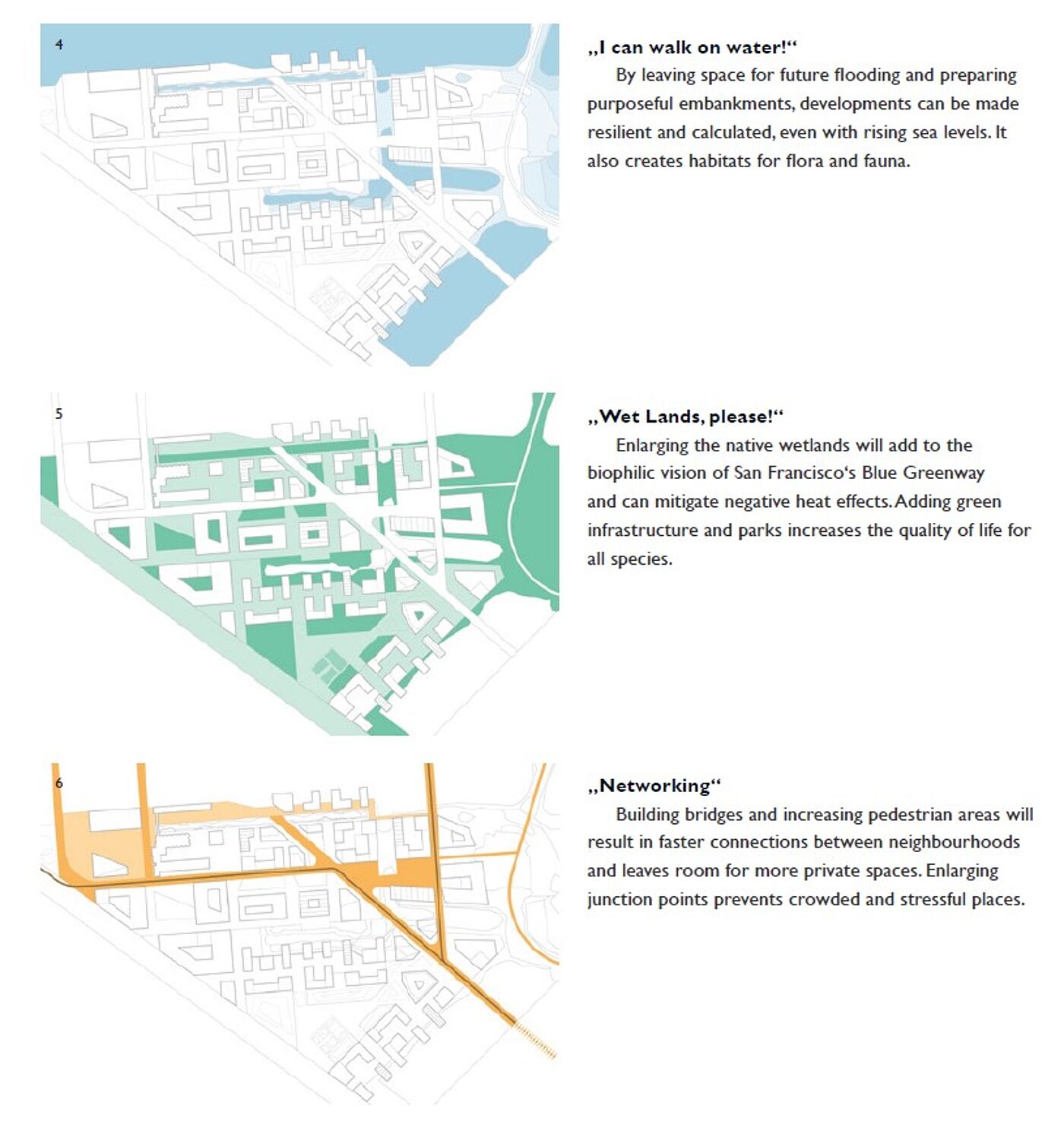 Cities are facing a wide variety of immense challenges these days. Resource Scarcity and the consequences of global climate change, such as rising sea levels, are pressuring current cities to transform. The city of San Francisco is no exception to that, especially in the context of the increasing importance of location factors and the image of cities. Special waterfront situations are being used to reposition themselves within this urban competition. Therefore, it is important to use waterfront potentials in a targeted manner and to integrate them into urban development concepts to create places that contribute to a specific identity and at the same time meet the challenges of climate change.