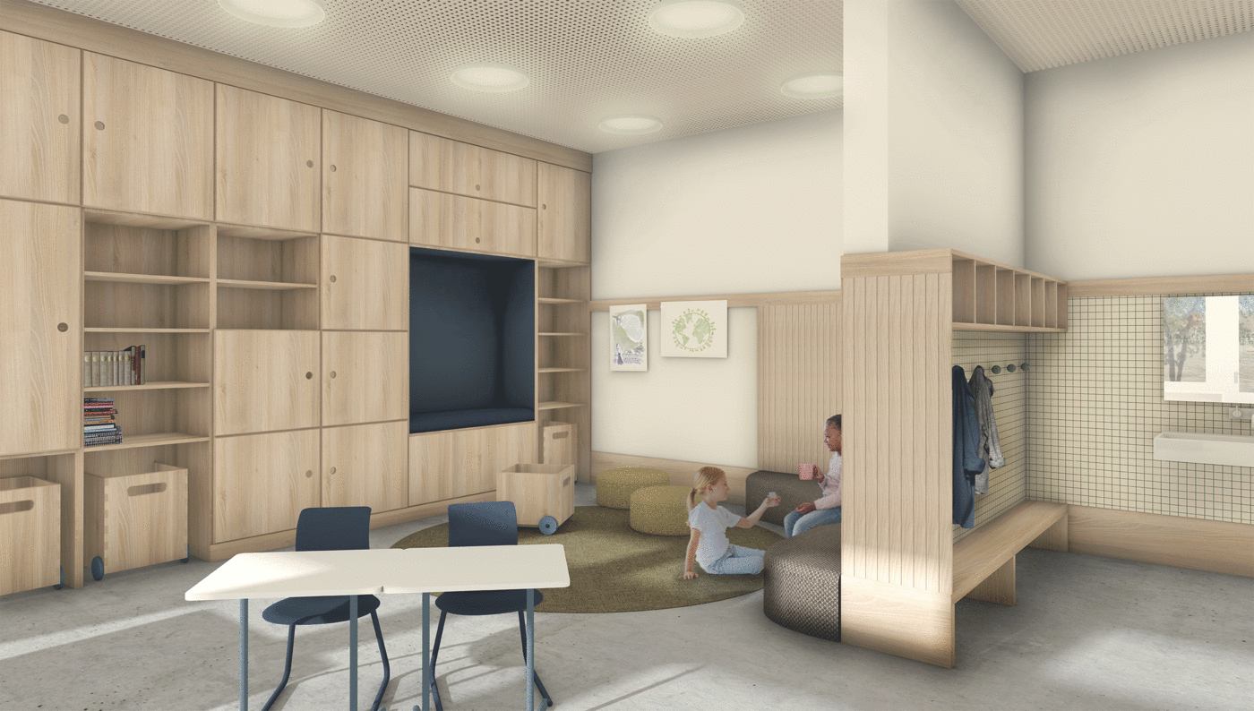 The subject of moor, which refers to the name of the school, serves as a guide in terms of materials and colors. Thus, you will mainly find natural materials such as wood or linoleum. Inside the rooms, the aim was to generate as much storage space as possible through installation so that the open space can be used flexibly.