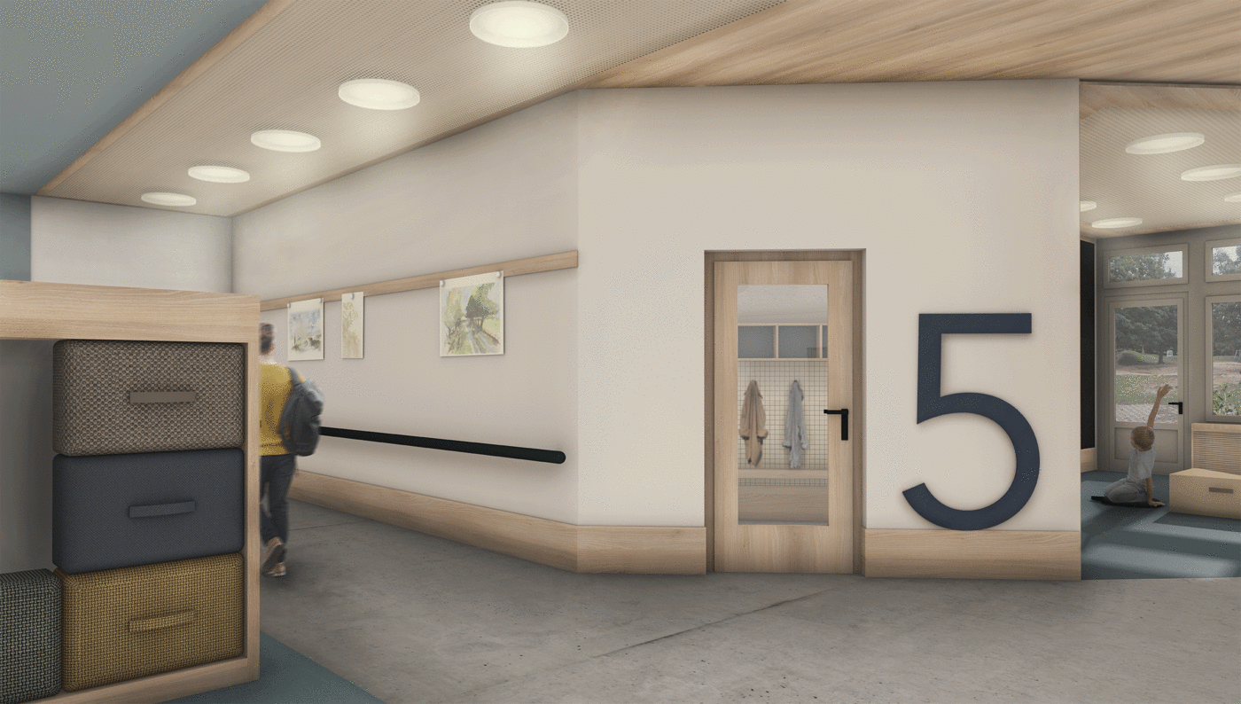 A uniform design should change the learning environment of the students in the long term. The planned restructuring of the premises is intended to support new possibilities for teaching lessons and to show flexibility in use. A scenario that is expected to occur in 2023/24, in which six classes will be outsourced, will create new space to be used and thus the opportunity for a change in the school on Papenmoor.