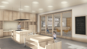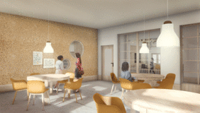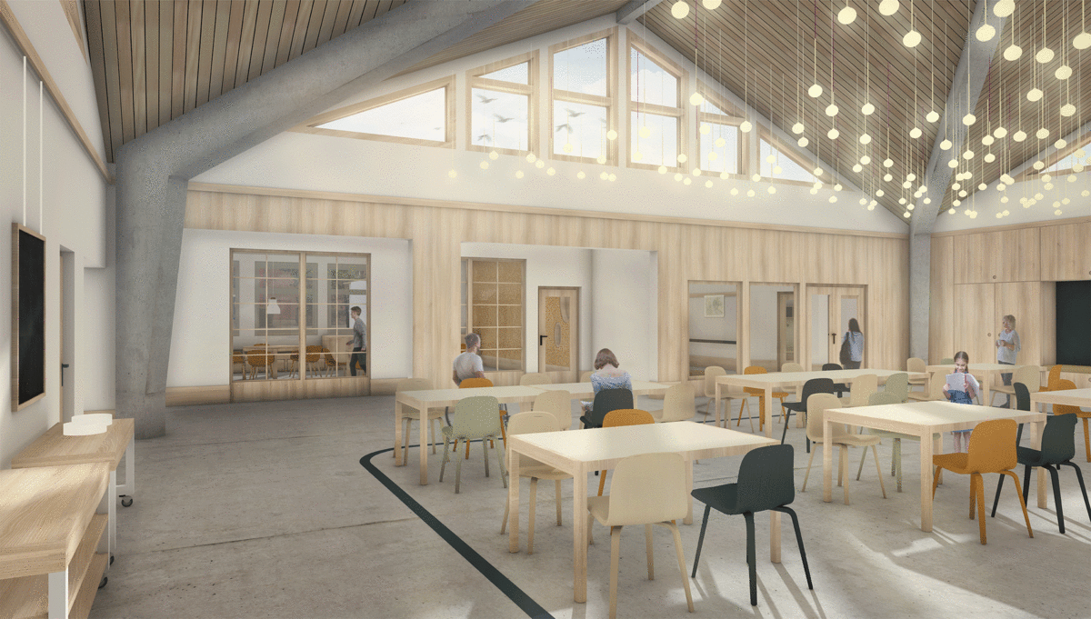 In addition to a new floor plan structure for the three floors, individual areas of the school were worked out as examples. These include the auditorium, the new teaching kitchen including adjoining rooms, a corridor with an integrated library, a learning landscape and a classroom.