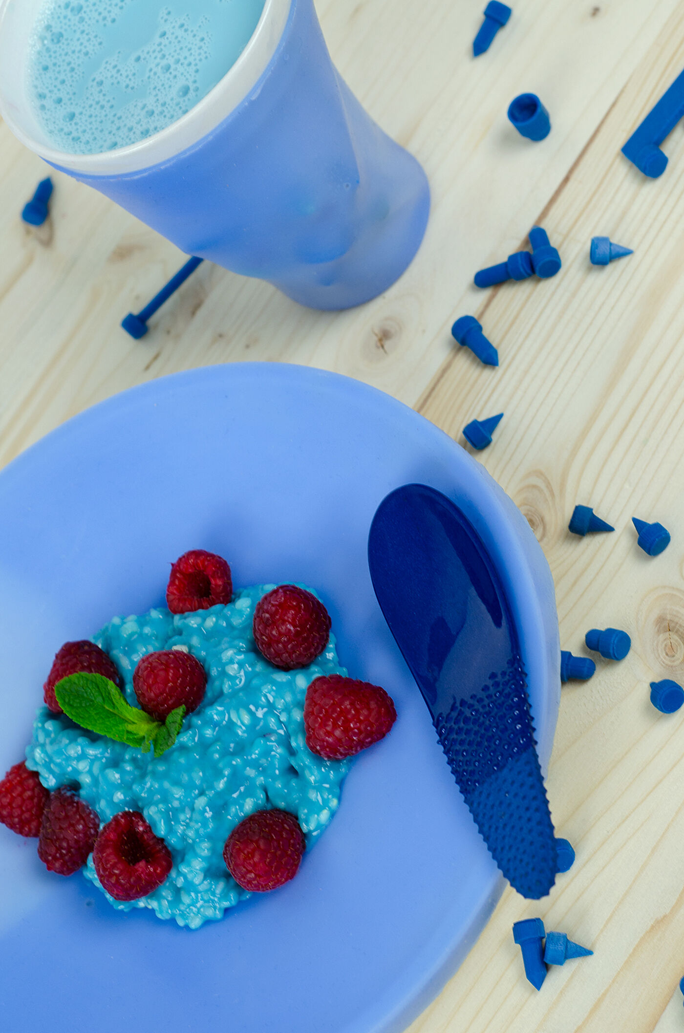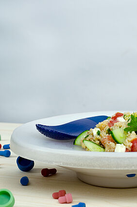 Das Ziel der Touch Meets Taste-Serie, bestehend aus klassischen Grundformen von Geschirrelementen und Besteckteilen, ist die experimentelle Untersuchung von Gestaltungspotenzialen, um das haptische Erlebnis sowie die spielerische Interaktion bei der Nahrungsaufnahme zu hinterfragen.