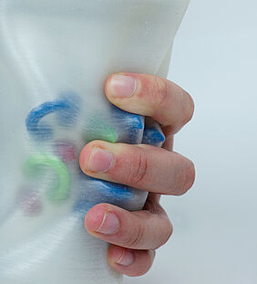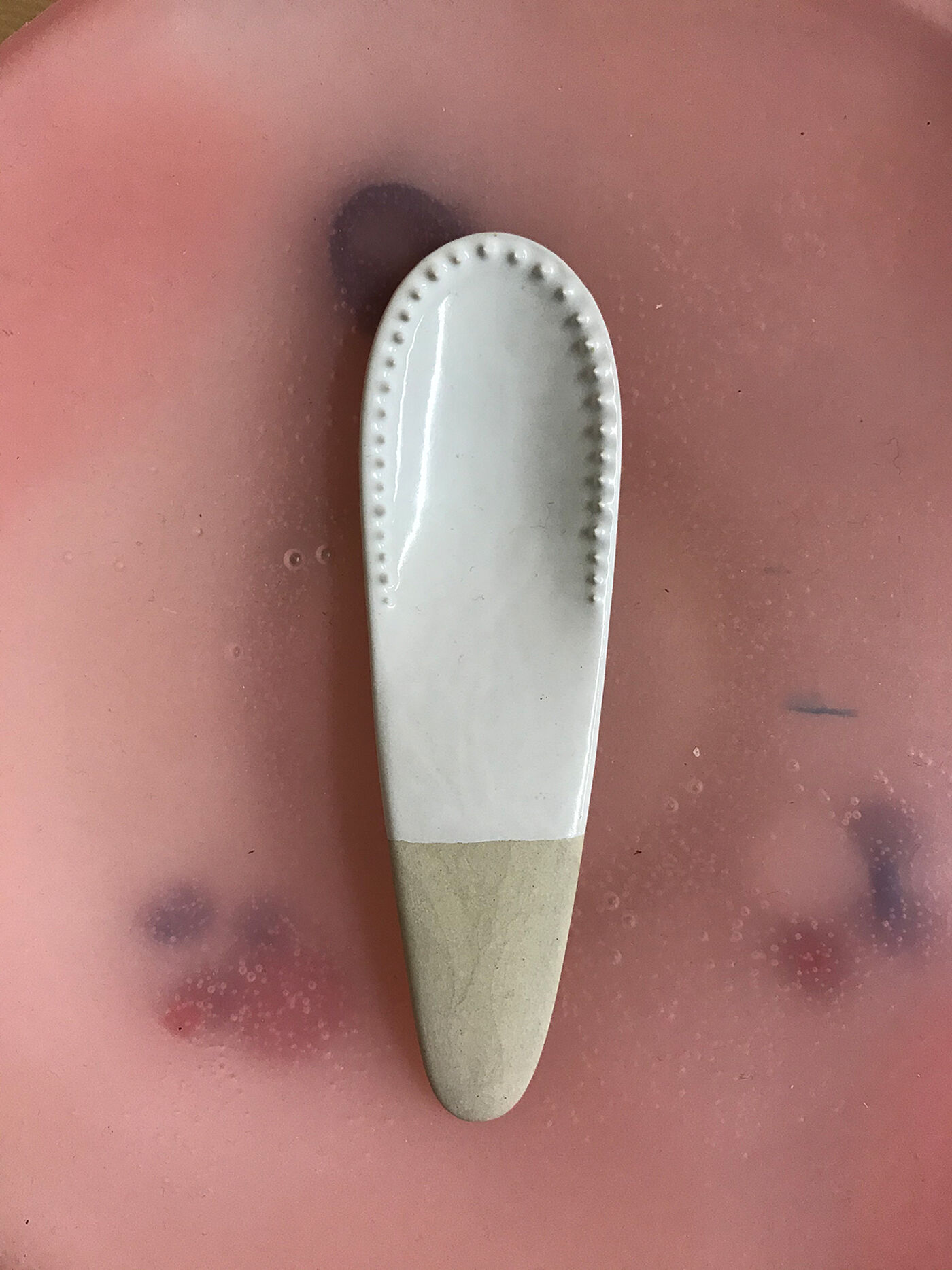Im Sinne der spielerischen Interaktion und des bewussteren Umgangs mit Essen, bietet schon das Anrichten von Lebensmitteln gestalterische Optionen unseren Geschmack zu prägen. Die Hauptinteraktionsflächen der unterschiedlichen Geschirrelemente – zum Beispiel, bei einem Becher die äußere Grifffläche oder bei einer Schale die Vertiefung, die das Essen aufnimmt – werden durch steckbare Elemente beeinflusst. Dies funktioniert bei beiden nach dem gleichen Prinzip. Es ist möglich kleine Steckelemente in vorhandene Löcher in der Keramik zu stecken und diese individuell zu positionieren. So beginnt der Prozess des Essens bereits beim Anrichten. Die kleinen Objekte haben unterschiedliche Größen, die es ermöglichen entweder durch ihren Kontakt mit der feinen Silikonhülle, unter der sie sich abzeichnen, direkt sichtbar zu werden oder durch Berührungen und Interaktion spürbar zu werden. Sie können das Silikon wölben und spannen und so beispielsweise bei der Schale diese in unterschiedliche Abschnitte teilen oder auch unterschiedliche Höhen erzeugen, welche einen größeren kreativen Spielraum beim Anrichten der Speisen ermöglichen. Sie können aber auch ungesehen bleiben und machen sich erst bei der direkten Interaktion bemerkbar. Der gewohnte Zustand von Geschirrserien in Porzellan und Glas wird durch eine flexible Latexschicht, die sogenannten „Nupsies“ und verschiedene Riffelungen und Texturen in den keramischen Oberflächen, irritierend gebrochen. Die gestalteten Objekte, sind nicht einfach nur Tassen, Teller und Löffel sondern sie treten mit uns in Kontakt und lassen uns aktiv wie passiv Berührungsreize wahrnehmen. Wie bei so vielen anderen unbekannten Oberflächen sind wir uns nur selten ihrer völligen Differenziertheit bewusst. Es sei denn, wir spüren eine Irritation, ärgern uns über eine Abweichung vom gewohnten Zustand oder im positiven Sinne, wir freuen uns über eine wohltuende nicht erwartete Erfahrung. Die Diplomarbeit spielt mit unserer taktilen Wahrnehmung unserer Erwartungshaltung und ruft zur bewussteren Beachtung von taktilen Einflüssen für unsere Geschmacksbildung auf.