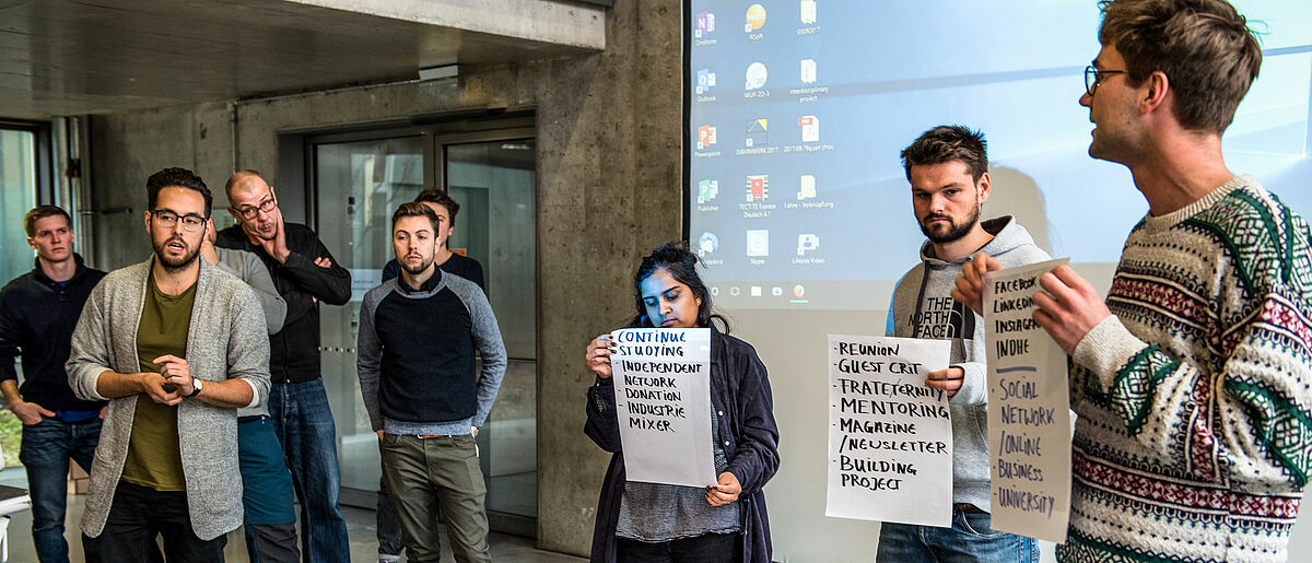home Universities, collected topics, activities and priorities that they themselves would be interested in, discussed various platforms and social media offerings. After intensive workshop work, the seven groups presented their results, including ideas for a thematic expansion of the annual DIA annual exhibition, lectures and contributions from alumni to teaching, printed T-shirts to carry the Faculty with them. They programmed an App, designed an alumni room as well as concrete content and topics for the alumni platform including suitable structures and functions.