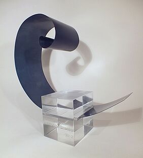 Die von Professorin Cornelia Hentschel betreute Studentin hatte sich entschlossen, die Gestaltung des Entwurfs durch den Zusammenklang von Natur und Mathematik faszinierend wirken zu lassen. Die nüchterne mathematische Konstruktion einer Fibonacci-Kurve einerseits und das natürliche Vorkommen der Fibonacci-Folge bei Wachstumsvorgängen wie Schneckenspiralen andererseits war die Grundlage ihrer weiteren Gestaltungsansätze. Für die Skulptur stellte die 22-Jährige die Spirale aus blau angelassenem Titan auf den Kopf, um sie als Welle verwenden zu können. Anne Ruddat entschied sich für Titan, weil dieses Material in der Forschung auch aufgrund des geringen Gewichts und der dennoch hohen Hitze- und Korrosionsbeständigkeit eine wichtige Rolle spielt. Sowohl Wellenform als auch die Blaufärbung schlagen optisch die Brücke zum maritimen Thema des Wissenschaftspreises. Durch das Zusammenspiel mit dem Plexiglas im Standfuß erhält die Farbigkeit der Welle zusätzlich Raum.