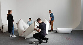 Der skulpturale Pavillon „Instant Space“ von Hannes Eggert, Joel Laurin, Frauke Nessler und Moritz Niebler aus dem Masterstudiengang Architektur der Fakultät Gestaltung der Hochschule Wismar besteht aus ehemaligen Transportkissen für Paneele des großen Saals der Elbphilharmonie, einem ausrangierten Feuerwehrschlauch und alter Maurerschnur und ist Teil der Ausstellung „9. RecyclingDesignpreis“ im nordrheinwestfälischen Designmuseum Marta Herford. Neben der Ausstellung findet sich die wandelbare luftgefüllte Konstruktion auch im ausstellungsbegleitenden Katalog (Format: 16,7 x 24 cm, Umfang: 48 Seiten, Sprache: deutsch und englisch, Unkostenbeitrag: 3,00 Euro) wieder. Die anfallenden Druck- und Zugkräfte werden über Luft und die Seile übertragen. Der Pavillon war bereits Bestandteil des Architektursommer 2019 in Hamburg im Oberhafen. Das Projekt ist im Rahmen eines experimentellen Tragwerkentwurfs entstanden und wurde von Prof. Dr. Asko Fromm und Architekt Philipp Loeper betreut.