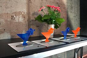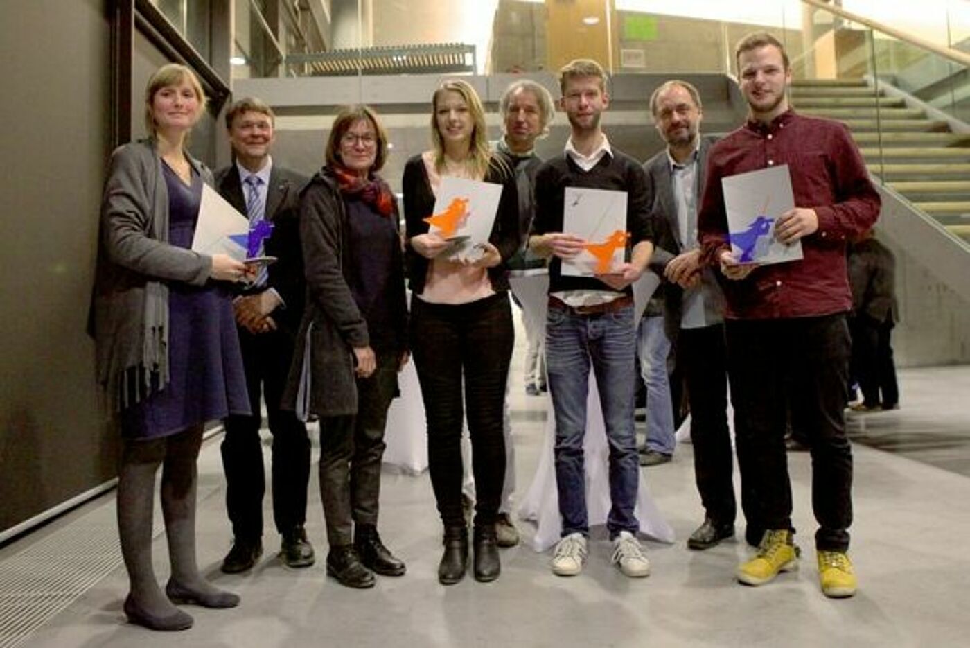 Die Preisträger Shannon Mesing (Bachelorstudiengang Maschinenbau), Anja Gaedcke (Masterstudiengang Innenarchitektur), Stephan Loewe (Diplomstudiengang Kommunikationsdesign und Medien) und Niklas Läsche (Dualer Bachelorstudiengang Mechatronik), stellten ihre Arbeiten im Rahmen der Preisverleihung dem Publikum vor. Der Innovationspreis der Stufe 1 und 2 gingen an Studierende der Fakultät Gestaltung.