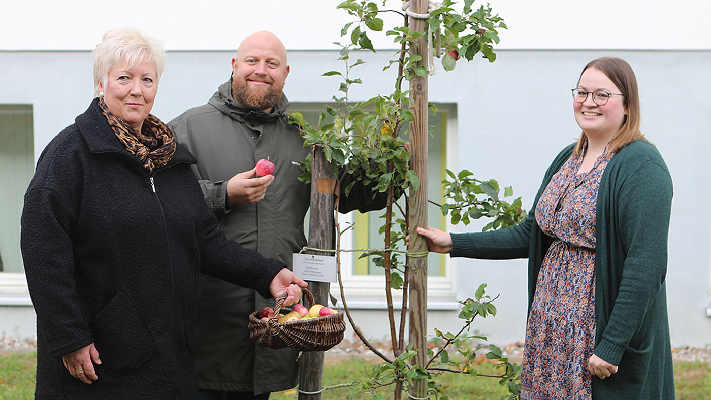 2019 haben Absolvent_innen des Masterstudienganges Architektur ein kleines Gravensteiner Apfelbäumchen auf dem Campus zwischen Haus 1 und Haus 2 gepflanzt. Das Abschiedsgeschenk hat in diesem Jahr reichlich Früchte getragen. Deshalb trafen sich die Ansprechpartnerin für Alumni im Studierendendezernat (Dez. II), Patrizia Malchow, die Alumniverantwortliche und seit vielen Jahren „gute Seele“ der Ehemaligen der Fakultät Gestaltung, Marion Tepper, und einer der Absolventen des Jahres 2019, Mike Horn, zur gemeinsamen Ernte.
