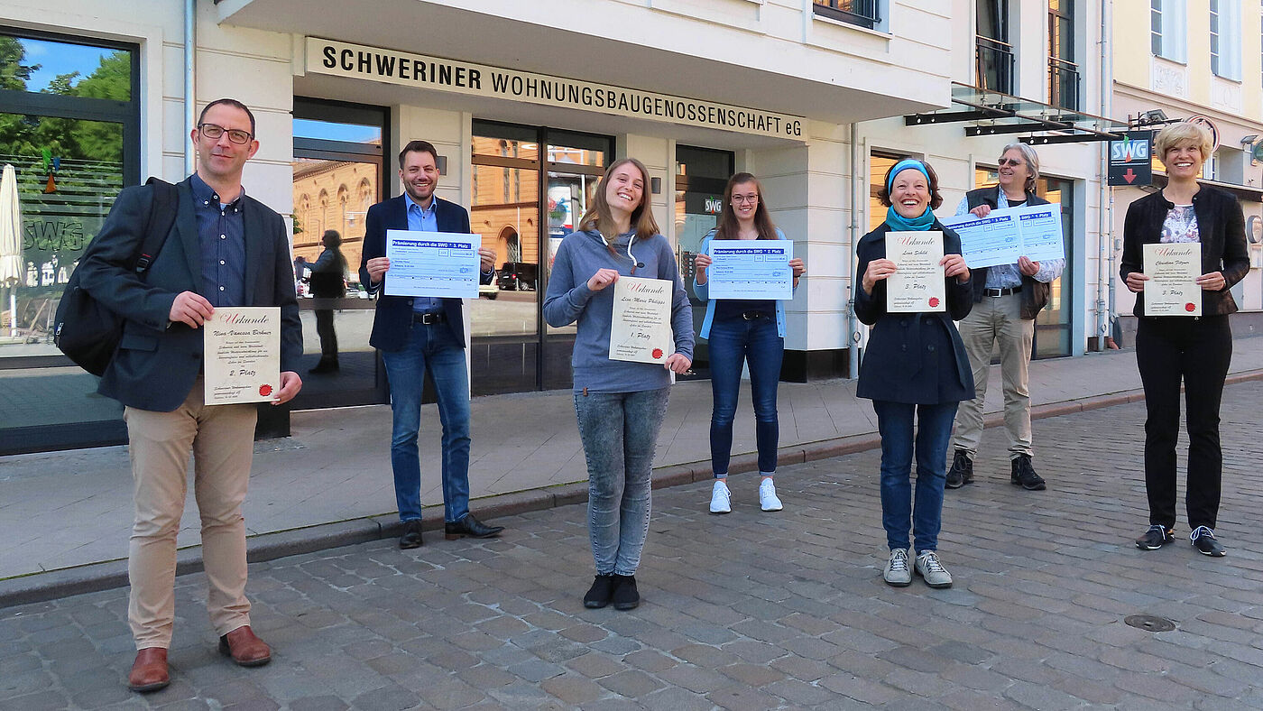 Diese Preisübergabe ist ungewöhnlich und eine ganz besondere Form der Wertschätzung: Vertreterinnen und Vertreter der Kooperationspartner postierten sich mit Urkunden und Schecks für ein Foto vor dem Stammsitz der Schweriner Wohnungsbaugenossenschaft eG (SWG) in der Arsenalstraße der Landeshauptstadt als optisches Dankeschön für die gute Zusammenarbeit.