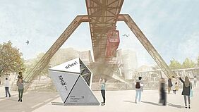 Von Annika Borchert wurde ein Faltwerk entworfen, das aus dreiecksförmigen, gelenkig verbundenen und mit Textil bespannten Holzelementen besteht. Das räumlich in unterschiedlicher Weise konfigurierbare Objekt, entwickelte sie aus Papier mit einer an Origami erinnernden Technik. Im Bodenbereich eingelassene piezogesteuerte und sensitiv auf Belastung reagierende Elemente führen zur Energiegewinnung beim Betreten des Objektes und bringen es zudem bei Nacht zum Leuchten.