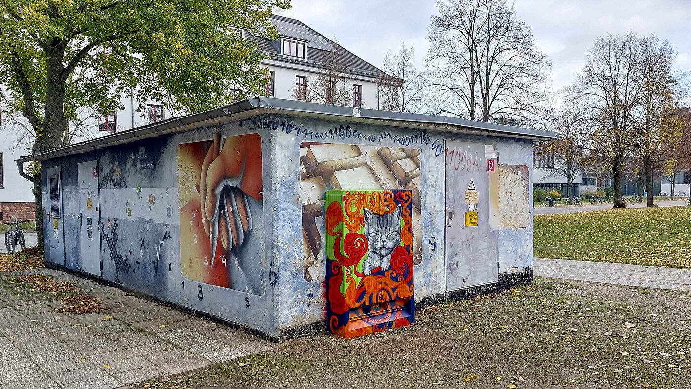 Mitglieder des Künstlerkollektivs haben übrigens nicht nur die Einfriedung des Werkhofes Haus 7c gestaltet, sondern waren auch an der Gestaltung des Hauses 9 sowie der Schaltkästen am Haus 6 und am Trafohaus vor der Bibliothek beteiligt. Derzeit gibt es keine weiteren konkreten Planungen für Graffitikunst auf dem Campus, auch wenn bei so manchem die eine oder andere neue Ideen reift.