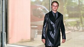 Zu einer „Hommage an Zaha“ [Hadid], die kürzlich verstorben ist, fühlten sich Julian Daden und Markus Trowski berufen: Sie übertrugen die Formensprache eines Entwurfs für eine antarktische Forschungsstation von Sergiu-Radu Pop, einem Studenten Hadids. Die biometrischen, aerodynamischen, aber nicht minder aggressiven Formen des Entwurfs, der hier und da an aktuelle Batman-Ästhetik erinnert, übertrugen sie auf ein Sakko.