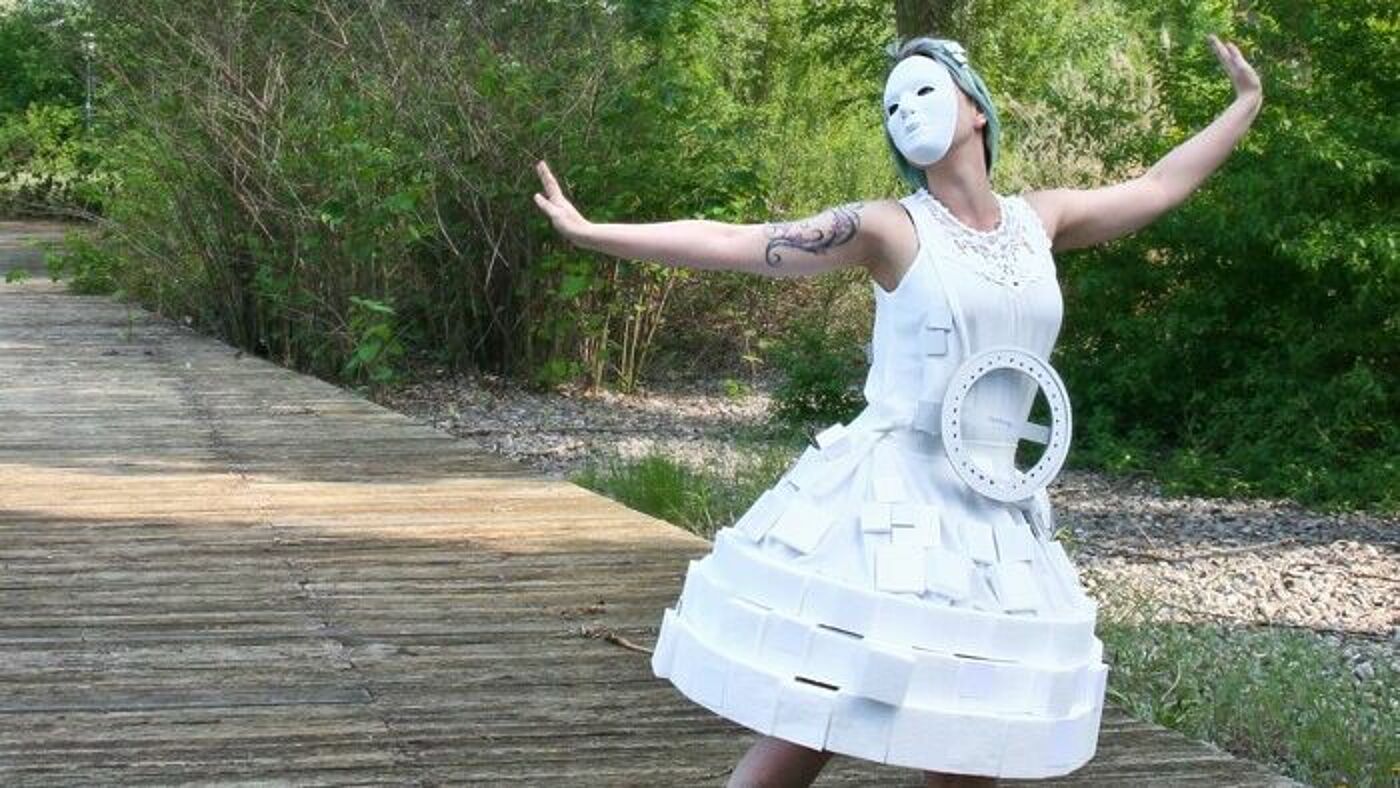 Sabine Gneiser präsentierte elfenhaft tanzend und hinter weißer Maske das Ergebnis: Ein Kleid mit weißen Bausteinkuben, das sich von unten nach oben rendert und wohl nie damit aufhört – symbolisiert durch einen um den Hals getragenen Bufferingkreis, auf dem in der Tat ein Lichtlein im Kreis wandert. Der Titel demnach „Von der Architektin, die kein Ende fand“ und der Abschluss natürlich „und wenn sie nicht gestorben ist, rendert sie noch heute“.