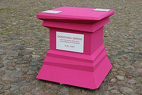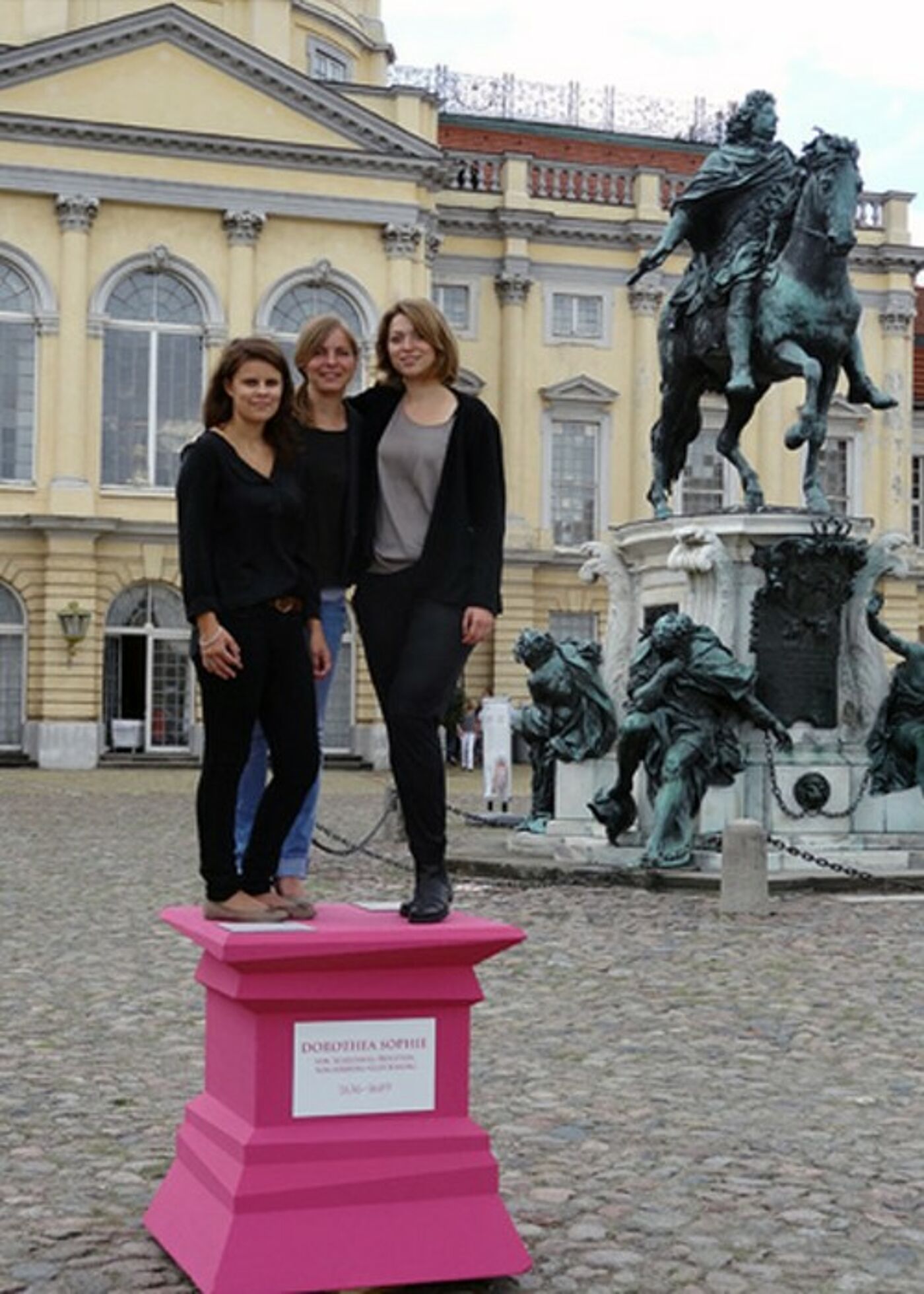 Sieben leere pinkfarbene Denkmalsockel rund um das Berliner Schloss Charlottenburg, vor der Villa Liegnitz in Potsdam und in der Zitadelle in Berlin-Spandau ziehen seit dem letzten Freitag im August 2014 die Blicke zahlreicher Besucher auf sich. Und genau das haben drei Studentinnen der Fakultät Gestaltung der Hochschule Wismar, Rebekka Menzel, Lina Berg und Anne Sell, beabsichtigt, als sie für die Stiftung Preußische Schlösser und Gärten Berlin-Brandenburg Entwürfe entwickelten. Ihr Ziel ist es, auf die im August nächsten Jahres beginnende kultur-historische Ausstellung „Frauensache. Wie Brandenburg Preußen wurde“ hinzuweisen.