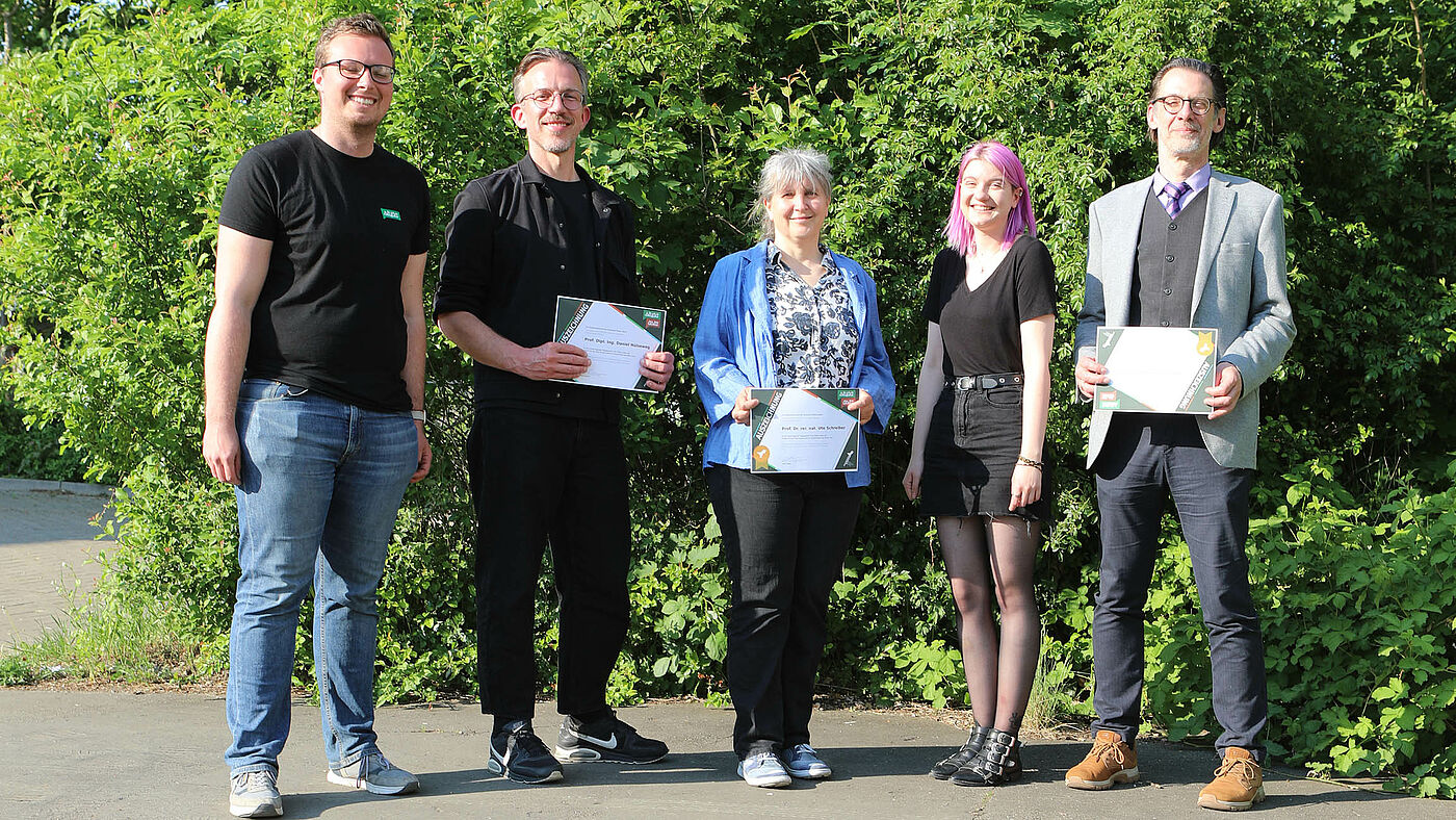 Es sind die drei Ausgezeichneten mit ihren Urkunden sowie die AStA-Vorsitzende und der StuPa-Präsident gemeinsam nahc der Preisverleihung zu sehen.