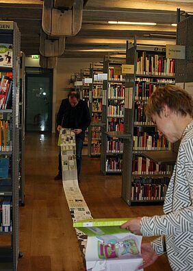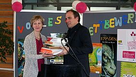 Im Rahmen des Vorlesewettbewerbs der 5. Klassen der Ostseeschule Wismar zum Welttag des Buches im Zeughaus der Hansestadt Wismar, übergibt Professor Achim Hack, Dekan der Fakultät Gestaltung der Hochschule Wismar am Montag, dem 25. April 2016 ein frisch geschnürtes Paket an die Leiterin der Stadtbibliothek, Uta Mach.