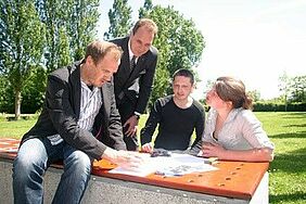 Innenarchitektur-Absolventin Hanna Stoff und Architektur-Student Erik Maroko diskutieren kurz vor ihrem Abflug nach Istanbul mit dem Professor für Marketing/Internationales Marketing, Dr. Christian Feuerhake, und dem Professor für Innenarchitektur, Achim Hack, Messestandentwürfe für die türkischen Unternehmen.