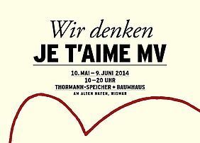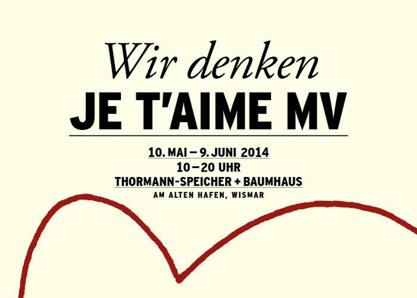 Mit dem Ausstellungstitel „Je t’aime MV“ bekundet die einzige staatliche Hochschuleinrichtung im Bereich der Gestaltung im nordöstlichsten Bundesland von Deutschland ihren Blick auf die Region. Die Ausstellung ist im Baumhaus und im Thormann-Speicher jeweils Dienstag bis Sonntag von 10:00 bis 20:00 Uhr geöffnet. Ein Rahmenprogramm bietet die Filmabende am Dienstag, dem 13. Mai 2014, und am Dienstag, dem 20. Mai 2014, um jeweils 20:00 Uhr und über die Pfingstfeiertage sind Kurzvorträge geplant. Alle Interessierten sind herzlich willkommen. Der Eintritt ist frei.