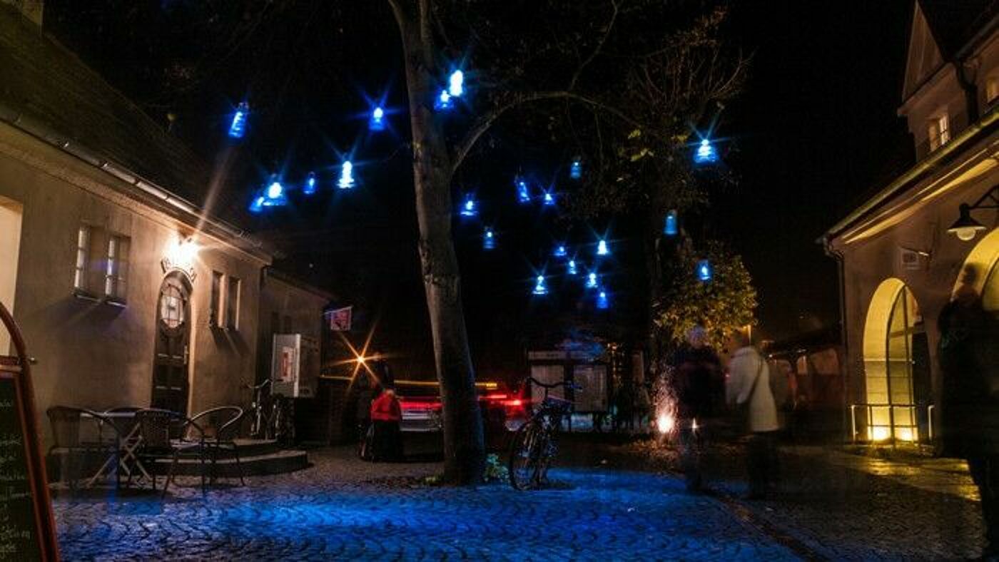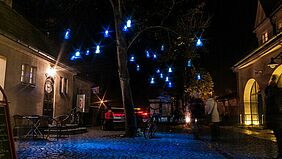 Das Kulturhaus mit seinem traditionellen Hopfenbewuchs statteten die Studierenden zum Beispiel mit kopfgroßen Leuchten in Form von Hopfendolden aus. Diese schufen die angehenden Lighting Designer zuvor aus Plastiklöffeln und Lampenfassungen. Der Hopfen selbst wurde beleuchtet und die Fenster erschienen in sattem Grün. Als Überbrückung vom Kulturhaus zum Bahnhof nutzten die Teilnehmer die Stadtmauerfragmente als „Zeitleiste des Lichts“: Angefangen mit offenem Schwedenfeuer (natürliches Licht) ging es vorbei an einigen Bambusfackeln (vom Menschen transportables Licht) zu einer freistehenden Reihe aus Glühbirnenstehlen (erstes elektrisches Licht) in einer Mauerlücke. Beendet wurde die Zeitleiste mit einem Netz kleiner LED-Leuchten, die die Gewölbe der Mauer betonten.