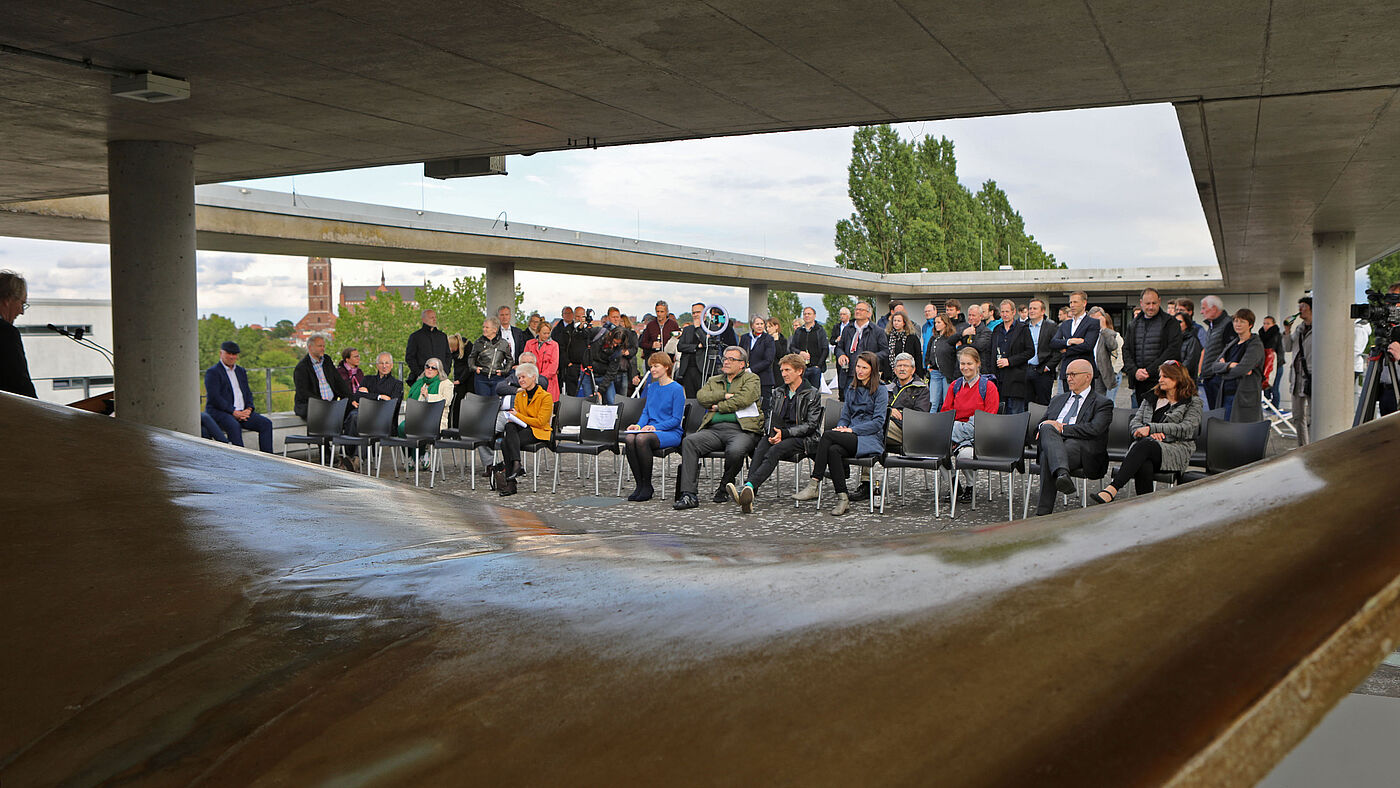 Auf der Dachterasse des Hauses 7a der Hochschule Wismar würdigten Vertreter_innen der Landesregierung, Politik, Wissenschaft und Forschung, Landesarchiv und Denkmalpflege, Bundes- und Landesingenieurkammer, Landesarchitektenkammer sowie Angehörige unserer Hochschule das Leben und Werk Ulrich Müthers. Die Zeugnisse seiner Arbeit sind noch heute weltweit zu finden. Zu den bekanntesten seiner Bauwerke in Mecklenburg-Vorpommern zählen der Teepott in Warnemünde oder die Seenotrettungsstation in Binz.
