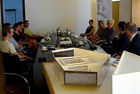 Von der Geschäftsstelle „Haus der Zukunft“ im BMBF waren die Projektleiterin Dr. Lisette Andreae, der designierte Gründungsdirektor, Prof. Dr. Reinhold Leinfelder, Professor an der Freien Universität Berlin, und die Referentin der Geschäftsstelle Dr. Marie-Claire Vigener anwesend. Die ÖPP Deutschland AG, ein unabhängiges Beratungsunternehmen für öffentliche Auftraggeber bei der Beratung und Begleitung Öffentlich-Privater Partnerschaften, war mit Karl-Heinz Heller, Direktor Partnerschaften Deutschland, und Michael Vahlert, Senior Manager Partnerschaften Deutschland, vertreten. Die Entwürfe der Studierenden erhielten insbesondere für ihre konzeptionellen Ansätze und ihre Bearbeitungstiefe ein positives Feedback der Anwesenden. Über eine mögliche Realisierbarkeit der Arbeiten wurde im Anschluss diskutiert. Zudem wurden Rahmenbedingungen und Vorgehensweise im Rahmen eines ÖPP-Verfahrens näher erläutert.